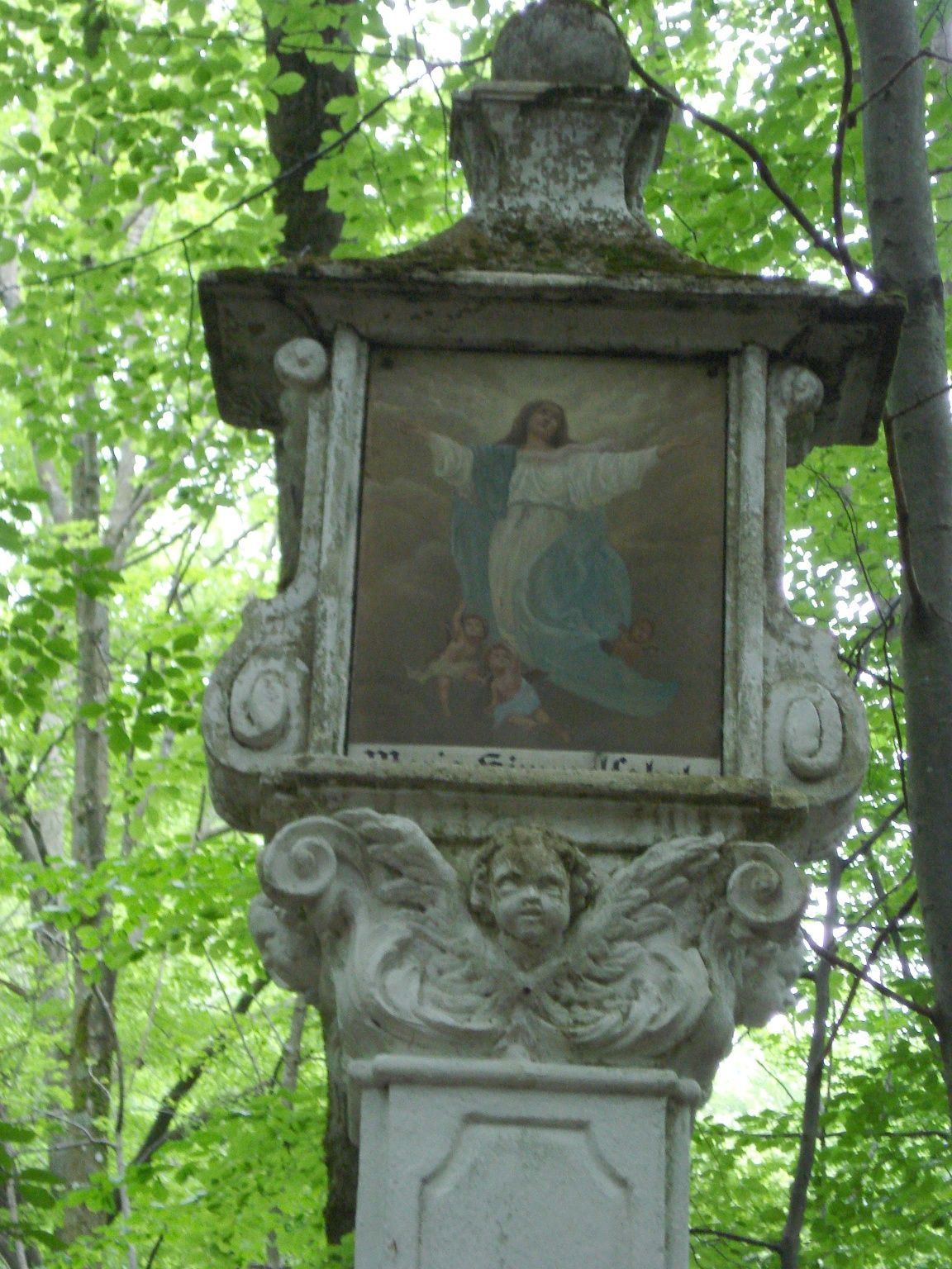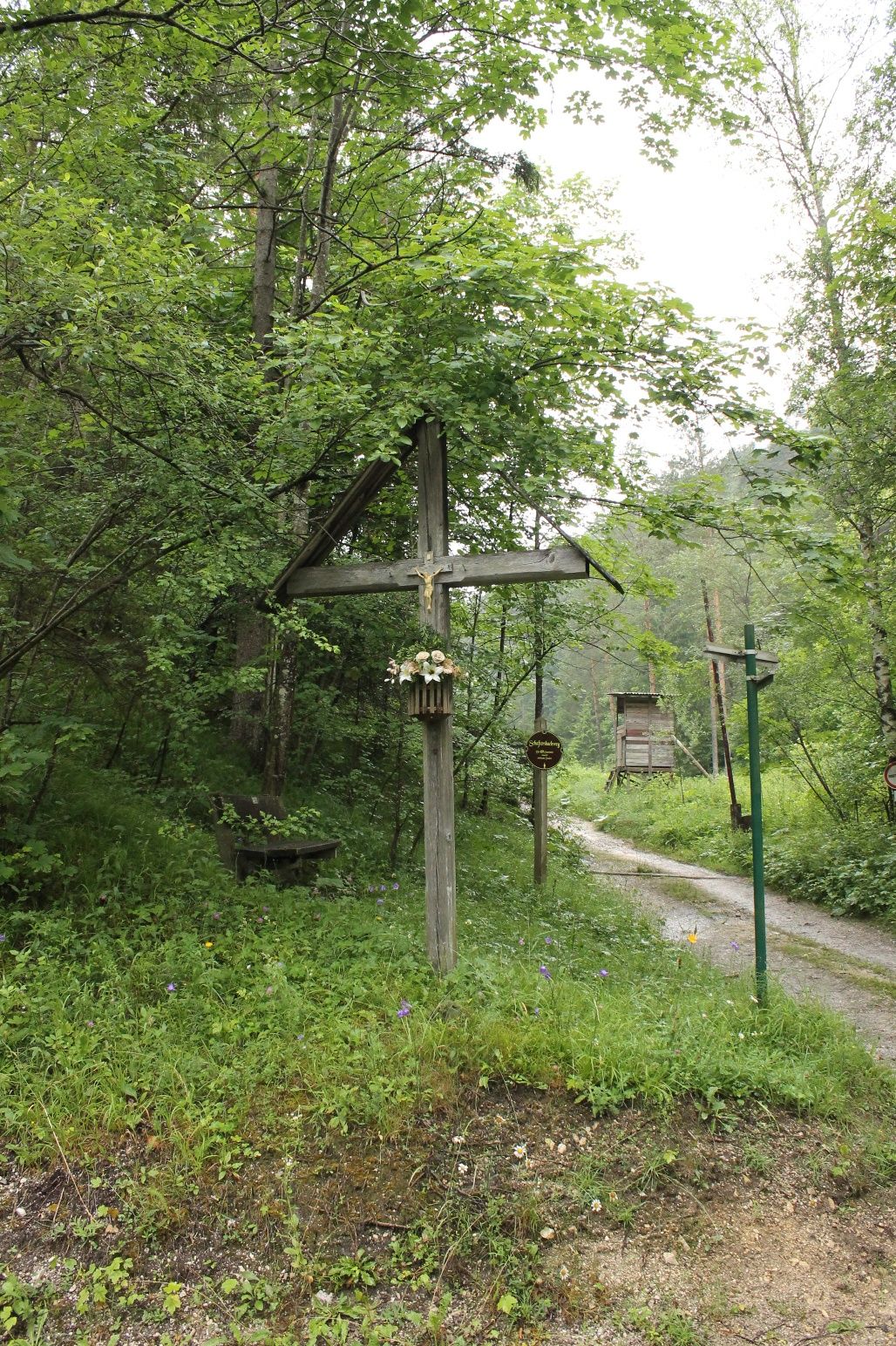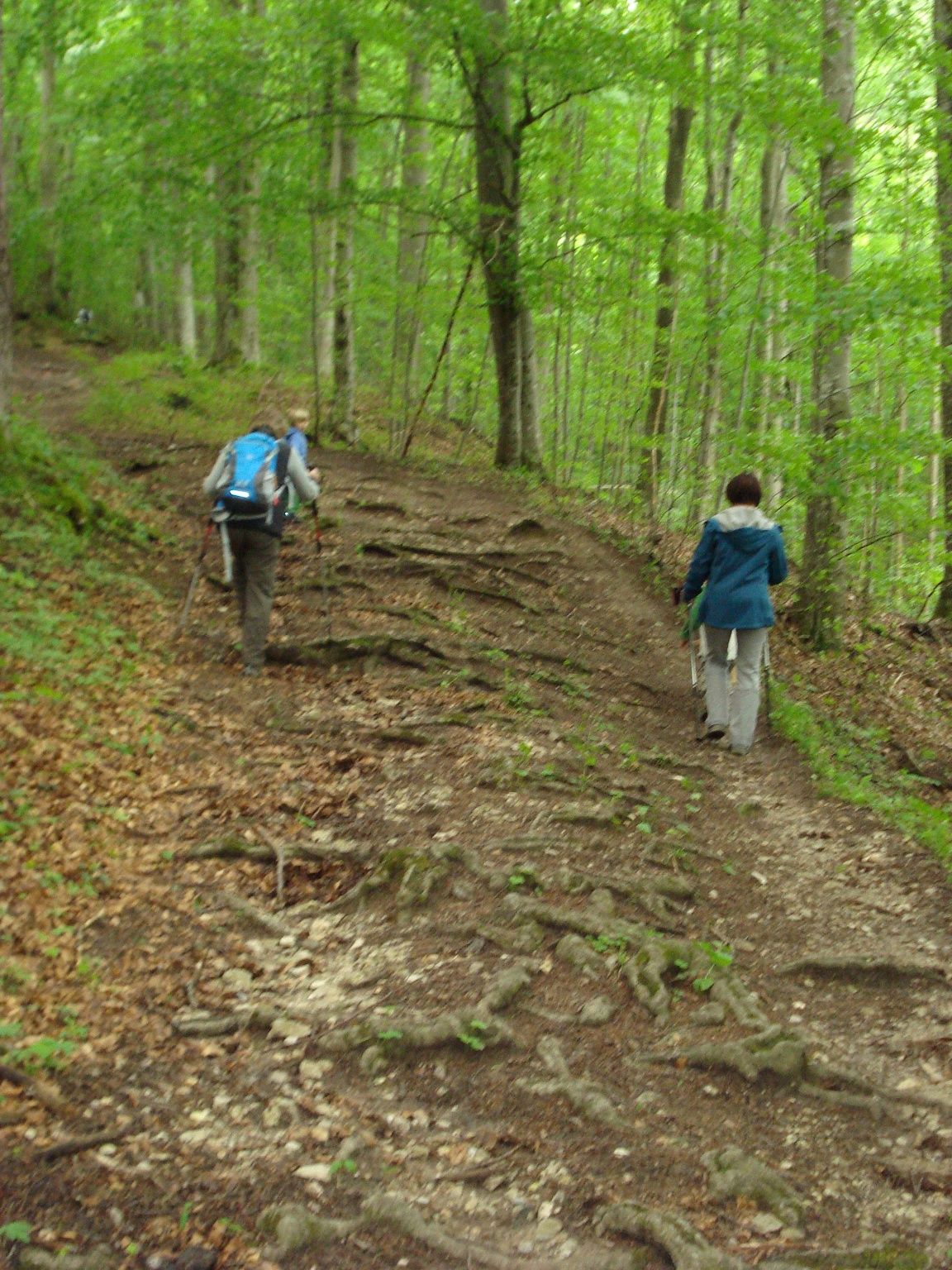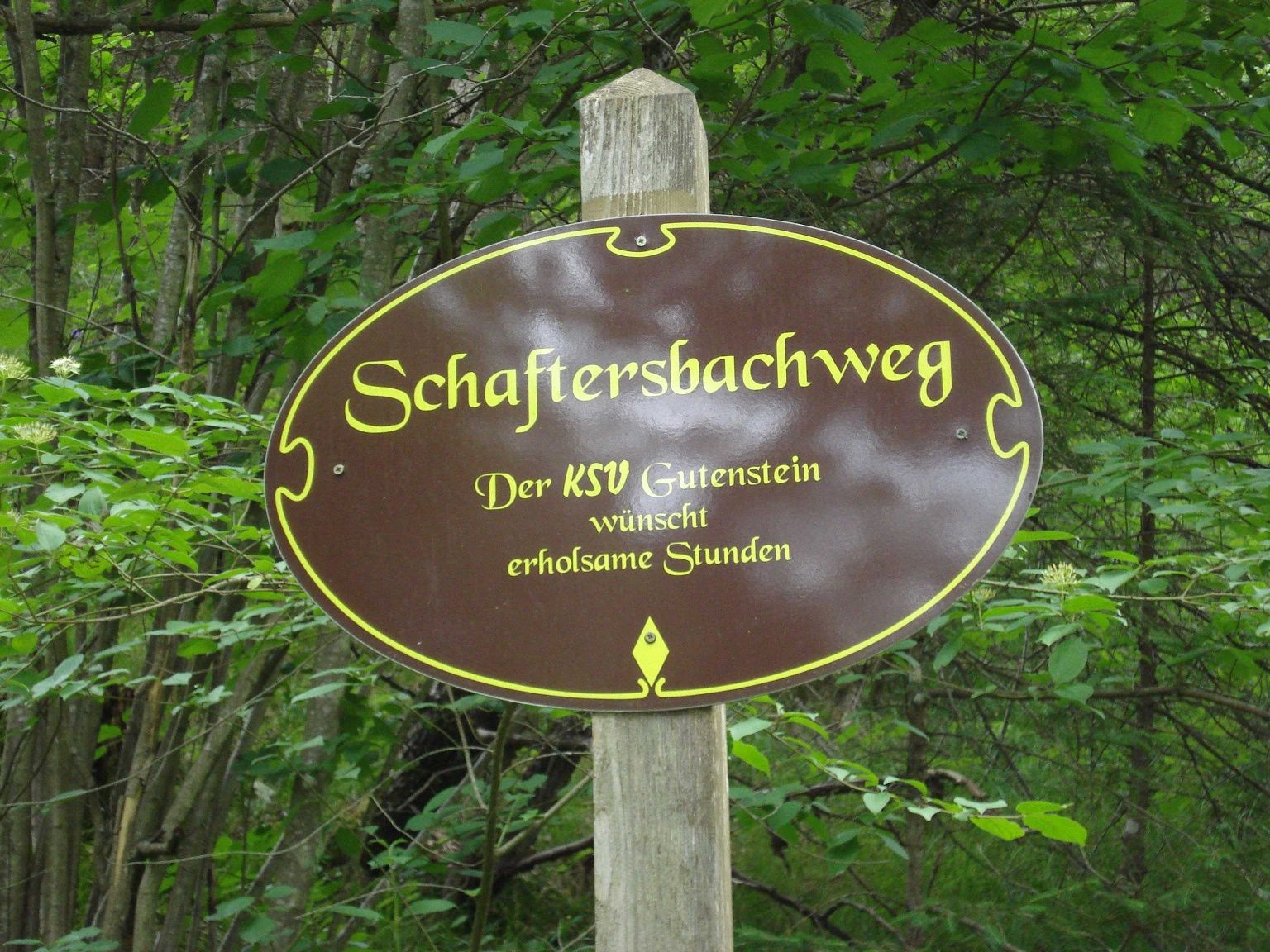 Von der Kirche absteigend, nehmen wir den Wurzelweg, entlang von Bildstöcken, die das Leben Mariens darstellen, wieder ins Tal zum Feuerwehrhaus zurück führt. Der dichte Buchenwald gestattet an einer Lichtung den Blick auf die Burgruine Gutenstein.