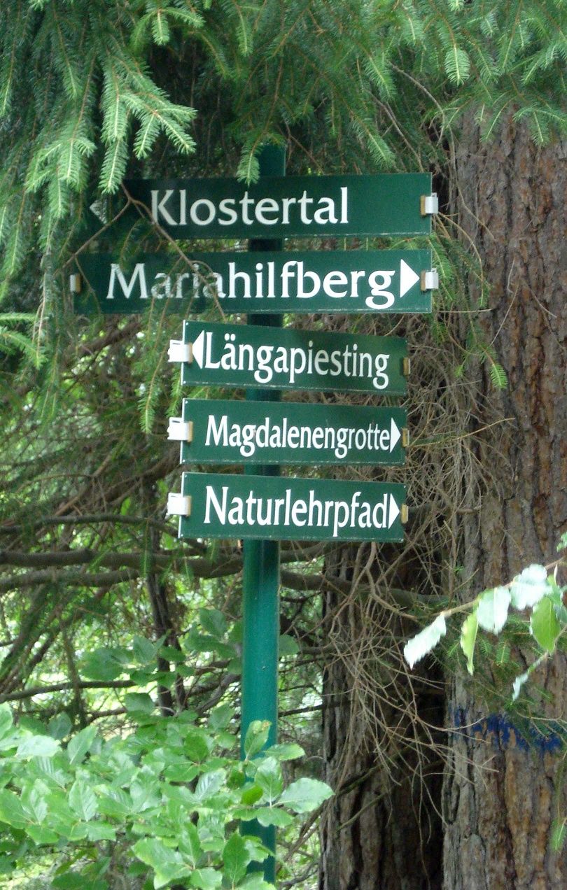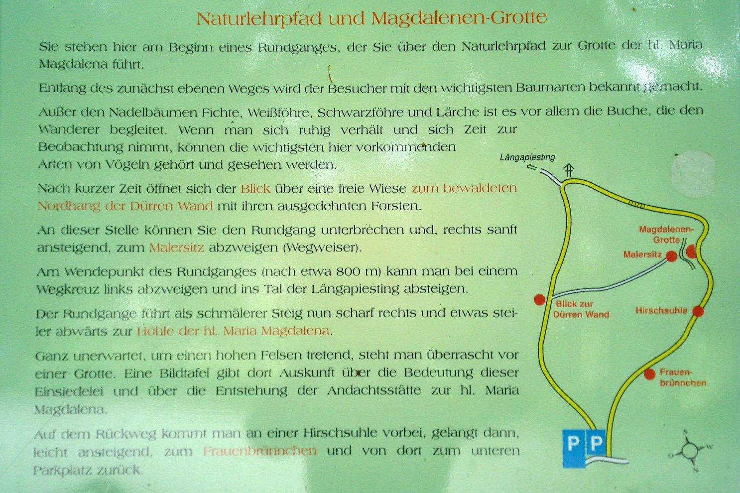 Wir starten vom Parkplatz der Pfarrkirche und folgen der Straße, die den Zaun des Schloßparks von Schloß Hoyos entlang führt in die sich öffnende Landschaft der Längapiesting. Beim Wegweiser auf den Mariahilfberg zweigt der Schaftersbachweg von der Straße ab und führt uns sanft ansteigend über Wiesen, dann an einem idyllisch gelegenen Häuschen vorbei über Waldwege bis zur Abzweigung zur Magdalenengrotte. Alternativ können wir am malerischen Marterl am Wegesrand vorbei über eine naturbelassene Wiese eben zum Naturlehrpfad gehen. Der Weg zur Magdalenengrotte führt landschaftlich ansprechend über teils Holz-, teils felsige Stufen durch einen Föhrenwald an einer Hirschsuhle sowie am Frauenbrünnchen vorbei zum Parkplatz am Mariahilfberg.