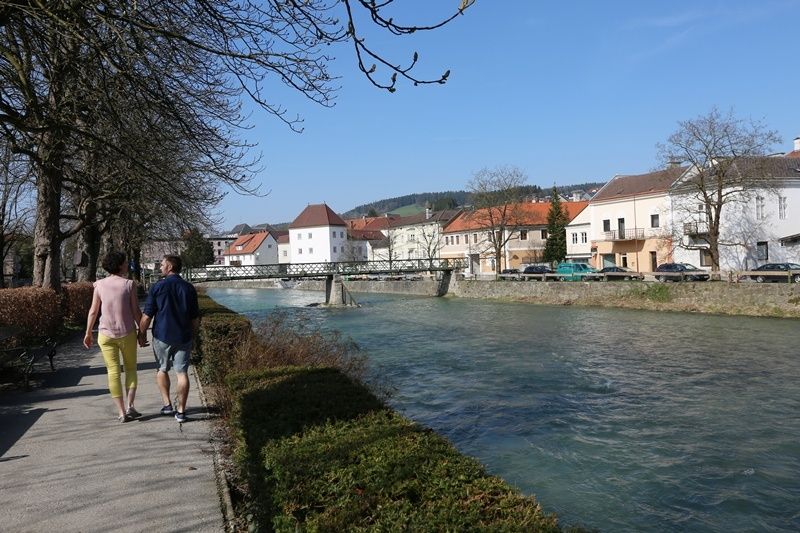 Wer das linke Erlaufufer mit Lese-, Liege- und Kneipp-Plätzen genießen möchte, flaniert entlang der Erlafpromenade Richtung Süden. Ein schöner Weg, mit Blick über den Fluss zur Altstadt auf der einen Seite und hübschen Sommerfrische-Villen auf der anderen. Zur Altstadt gelangen Sie dann über die Töpperbrücke vorbei an der alten Nagelschmiede und dem Gamingertor über die Hauptstraße wieder zurück zum Sandsteg.