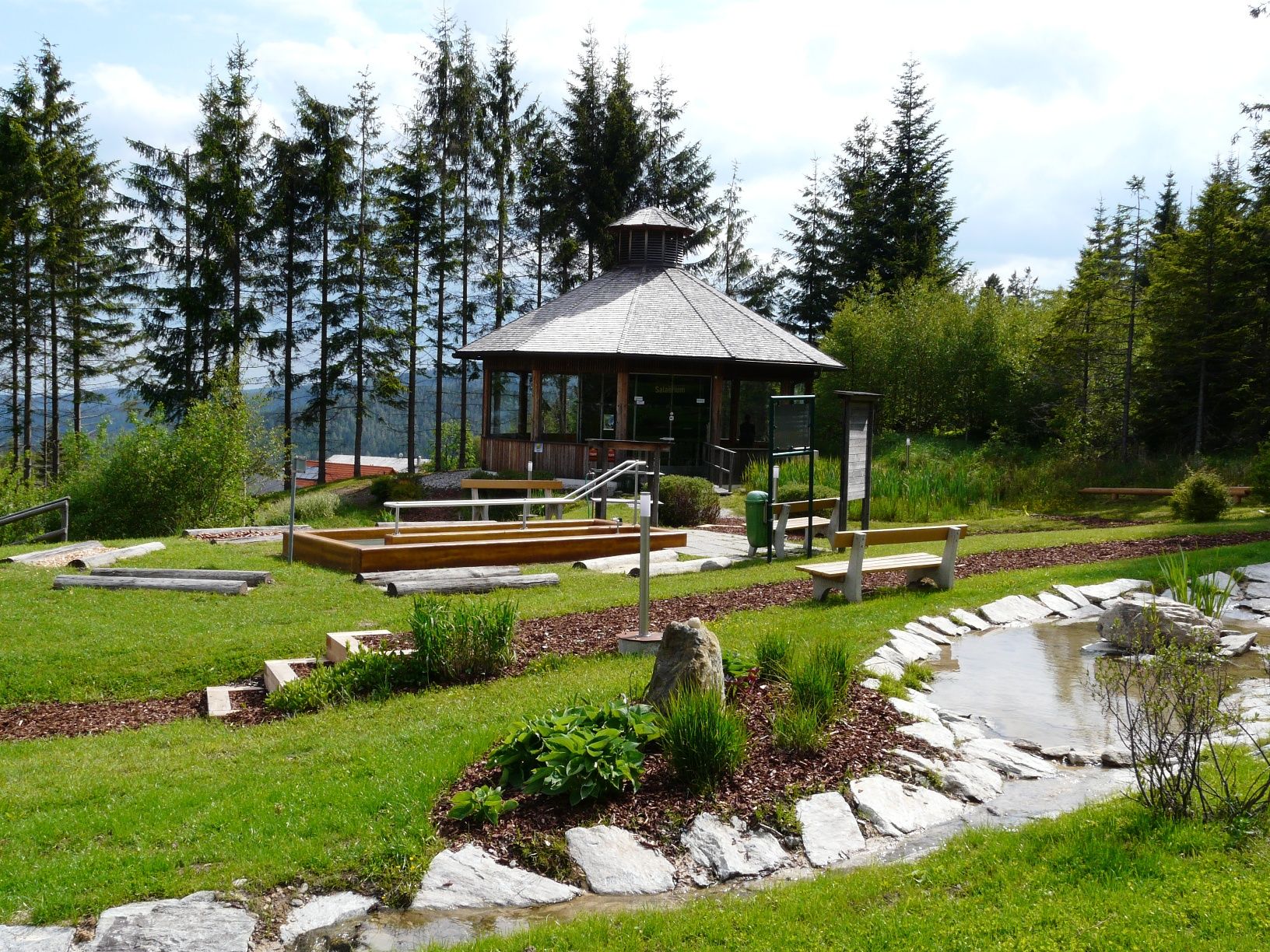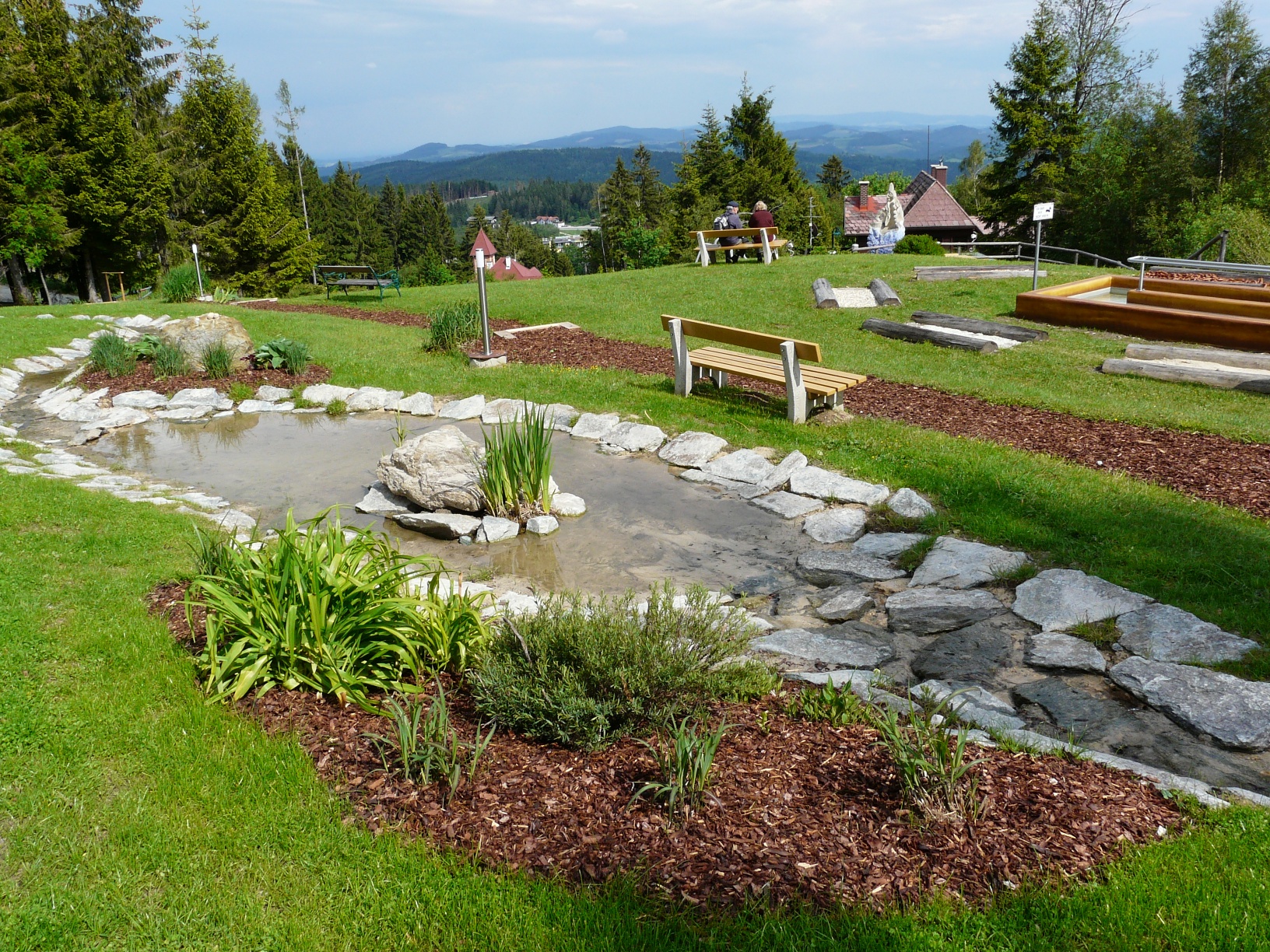 Am Themenweg Lebenswasser kann man sich mit Fragen über den Wasserkreislauf vom Regen über den Ursprung einer Quelle bis zum Bächlein und zum Teich zu beschäftigen.