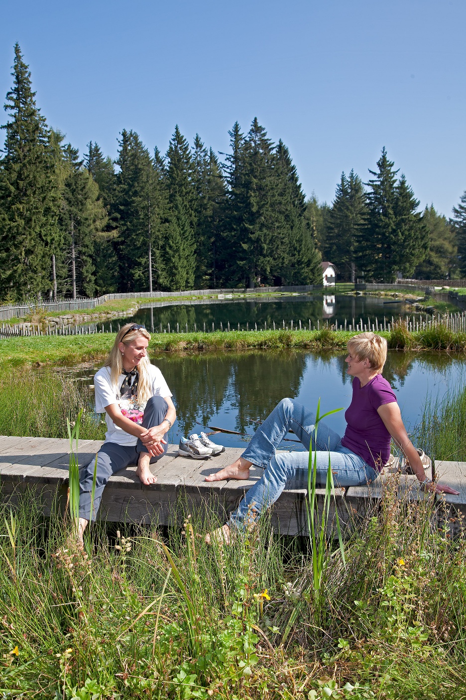 Wasserversorgung und Wasserspeicherung in Vergangenheit und Gegenwart. Bei einer kleinen Schauquelle im Wald, lässt sich anschaulich verfolgen, wie das Wasser sofort nach Austritt zwischen den Steinen durch ein Rohr gefiltert wird, um dann, durch Kieselgrund fließend nochmals gefiltert, zum Trinkwasserspeicher zu rinnen. Auf den sanften Wiesen der Mönichkirchner Schwaig erreicht man schließlich, eine von der Wechselquelle gespeisten Teich mit Wasser in Trinkwasserqualität, das als Löschwasser und für die Beschneiung der Piste im Winter verwendet wird. Ein Biotop neben dem Teich beherbergt eine riesige Anzahl von Tieren, die auf einer Schautafel erklärt sind. Am Grenzbacherl Niederösterreich - Steiermark lässt es sich dann gut ausruhen und in den Almhütten gut einkehren, ehe Sie sich wieder auf den Rückweg hinunter ins Dorf machen. sich mit Fragen über den Wasserkreislauf vom Regen über den Ursprung einer Quelle bis zum Bächlein und zum Teich zu beschäftigen.