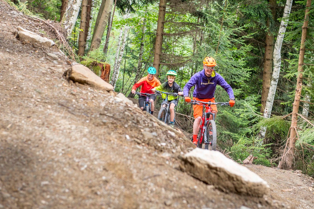 Der 5,3 km lange Uphill-Flowtrail sorgt für ordentlichen Spaß bergauf und lässt sich von Groß bis Klein bewältigen. Ein gänzlich neues Fahrgefühl macht sich selbst bei erfahrenen Mountainbikern breit, denn dank E-Bikes ist Airtime bei Tables und Anlegern selbst im Anstieg garantiert. Ausprobieren lohnt sich! Ist man am höchsten Punkt des Flowtrails angelangt, wartet schon die Belohnung: der Flowtrail zum Bergabfahren!