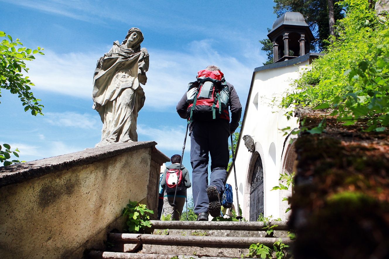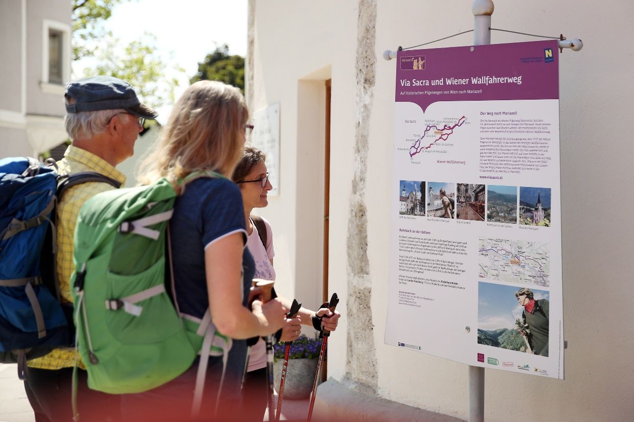 Von Kaumberg geht es hinauf zur Araburg, wo kurz nach der Burg der Wiener Wallfahrerweg nach Rohr im Gebirge (über Unterberg) abzweigt. Die Via Sacra führt über einen aussichtsreichen Höhenweg und durch den Wald hinunter ins Gölsental nach Hainfeld (04:15 h). Ab Hainfeld geht es durch den Wald nach Rohrbach und anschließend entlang der Gölsen nach St. Veit, wo man den „Dom des Gölsentals“ besuchen kann (03:00 h). Die vorgeschlagene, landschaftlich großartige Bergroute führt mit zweimaligem Anstieg über das Gehöft Hochreiter – Wiesenbach – Vorderebendirekt nach Lilienfeld (04:30 h). Es lohnt sich ein Besuch im Zisterzienserstift Lilienfeld, das seit Beginn der Pilger- und Wallfahrtstradition ein wichtiger Zwischenstopp an der Via Sacra und die älteste mittelalterliche Klosteranlage Österreichs ist.