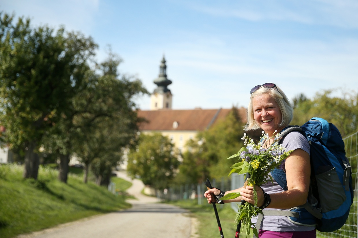 Die Etappe 5 der Via Trinitatis + beginnen wir wieder am Stiftsportal. Wir begeben uns über die rechtsseitige Stiege vom „Klosterberg“ Richtung „Amstettner Straße“ und folgen dieser bis zur schon sichtbaren Seitenstettner Filialkirche „St. Veit“. Die nächsten 1,5 km wandern wir entspannt auf einem Auweg durch die „Fröschlau“, immer wieder entlang der „Treffling“, bis zur Straßeneinmündung bei der „Schippermühle“. Hier zweigen wir rechts ab, vorbei am großen Sägewerk, und nehmen die Kehre zum obenliegenden Bauernhof. Knapp 1 km folgen wir dem Straßenverlauf und treffen dort auf den Biberbacher Kapellenweg „Haidschachen“. Dieses neu kreierte Wegenetz bringt uns zu beachtenswerten Kleinoden von Biberbach. Nach dem „Kapellenbildstock Prastrum“ biegen wir rechts ab zum Geflügelhof „Leithen“. Dort führt links ein Weg entlang von Feldrainen zur Querung des „Blümelsbergergrabens“ und einem Gehöft, das wir südseitig umgehen. Wiederum entlang von Feldrändern treffen wir auf das „Wegkreuz Großhub“. Hier biegen wir rechts auf die L 6206 bis zur Kreuzung beim „Thalbauern“. Dort zweigt der Kapellenweg links auf einen Feldweg ab und nach der Querung des „Biberbachs“ gelangen wir am linksseitigen Waldrand bis zur Ortseinfahrt. An Siedlungshäusern entlang erreichen wir den Ortskern und die Pfarrkirche zum Hl. Stephanus. Mehrere Gastronomiebetriebe bieten sich für eine Einkehr an. Unsere Pilgerung setzt sich dann beim östlichen Ausgang des Friedhofs auf der Ortsdurchfahrt fort. Wir teilen uns die Route mit dem „Oismühlweg 382“ und gelangen, erst links, dann halbrechts abbiegend, zum „Biberbacher Erlebnis-Waldspielplatz“. Ab hier führt die Route rechts durch ein Waldstück, vorbei an einem Teich, bis „Helpersdorf“. Die einmündende Straße gerade übersetzend, nehmen wir die Schleife um die rechtsliegenden Häuser und biegen dann links abwärts, queren den „Illmersbach“ und die vor uns liegende Wiese. Etwa 100 m geradeaus erkennen wir dann auch den Aufstieg durch den kleinen Waldhain und kommen entlang eines Feldweges zur Straße „Stupfreith“. Rechts abbiegend führt uns diese etwa 100 m weiter zu einem links liegenden Feldrain. Weiter über Wald- und Wiesenwege erreichen wir das „Kreuz Kicking“ vom Biberbacher Kapellenweg „Kromos“. Hier verlassen wir den „Oismühlweg“ nach links und biegen kurz danach an der Kreuzung rechts auf den Schotterweg, der uns zur Gemeindestraße „Trauner“ bringt. Gemeinsam mit der „Stiftsblick-Radroute“ führt uns die Straße dann zum imposanten „Schoderhof“. Bei dem für diese Gegend typischen Vierkanthof bleiben wir weiter auf der Radroute und biegen nach dem „Moarhaus“ leicht links Richtung Wald ab. Am Höhenrücken angelangt, treffen wir links auf den „Schneerosenweg“, der uns unmittelbar nach dem Einstieg in das Gemeindegebiet von Kematen/Ybbs führt. Diesem folgend, grüßt rechterhand immer wieder „unser Sonntagberg“. Der besonders im Frühjahr beliebte Naturweg begleitet uns bis kurz vor den „Kreuzstöcklberg“. Dort führt uns der Weg leicht rechts zum Bildstock, wo uns der „sagenumwobene Drehstein“ erwartet. Wir setzen nordseitig unseren Weg seitlich der Straße etwa 100 m abwärts fort und queren diese, um wieder auf den „Schneerosenweg“ zu kommen. Wir folgen diesem bis zur Einmündung der Gemeindestraße und biegen dann rechts über einen Schotterweg nach „Kalsing“ ab. An der Ortsdurchfahrt ankommend, gehen wir rechts und biegen schon bei der nächsten linksseitigen Abzweigung abwärts Richtung Feldweg ab. Dieser bringt uns dann direkt auf die „Heide 3. Straße“, dort rechts weiter abwärts zum Kreisverkehr der Bundesstraße 121. Wir überqueren hier die großzügige Brücke über die Ybbs und treffen im Gemeindegebiet von Allhartsberg auf den rechts wegführenden „Naturbadweg 236“. Idyllisch entlang der Ybbs führend, steigen wir am Ende des Naturbads die Geländestufe hoch und folgen dem Feldweg des „Weges 236“ über „Angerholz“ bis Allhartsberg. Hier besuchen wir die Pfarrkirche zur Hl. Katharina und gönnen uns eventuell eine Einkehr im einladenden „Allhartsbergerhof“, bevor wir zum letzten Etappenabschnitt aufbrechen. Den Aufstieg zu unserem Pilgerziel am Sonntagberg beginnen wir auf der Ortsstraße von Allhartsberg bis zum Zeughaus der Freiwilligen Feuerwehr, wo uns eine monumentale Figur des Hl. Florian begegnet. Hier biegen wir rechts auf den „Mühlenweg 240“ abwärts bis zur Querung des Ödelbachs. Dort verlassen wir diesen und gehen rechts, um nach dem kurzen Wiesenstück auf den „Mostviertelblickweg 239“ (umgekehrte Markierungsrichtung!) über einen Feld- und Spurweg zu den Häusern von Maierhofen hochzusteigen. Dort folgen wir dem Straßenverlauf durch den Ortsteil und erreichen weiter hinauf, an zwei Bauernhäusern vorbei, über eine Kehre am beginnenden Forstweg den „Mostviertelblick“. Der weitere Weg führt uns dann durch den jungen Buchenwald bis auf den Höhenrücken der „Panorama Höhenstraße“. Schon bekannt aus der Etappe 1, nehmen wir hier den WWW 08 „Eisenwurzenweg“ zurück bis zu unserem Pilgerziel, der Basilika am Sonntagberg. Dieser führt uns entgegen der Etappe 1 über den Höhenweg bei der zweiten Sonntagberger Richtfunkstation „Herzogberg“. Über den „Wald der Sinne“ und am Bergfriedhof vorbei, kommen wir über den „Kulturwanderweg“ wieder an die Südseite der Basilika. Wir haben nun das Ziel unserer Pilgerwanderung erreicht. Dankbar für die Erfahrung, die uns von Beginn an begleitet hat: „Wer unterm Schutz des Höchsten geht,…“. Via Trinitatis – ein >Weg der Dreifaltigkeit<, der uns über das Aufbrechen, Gehen, Unterwegssein, Ankommen und Dasein näher gebracht hat, was dem Sonntagberg zugeschrieben wird: „Dem Himmel näher“. Eine Hausaufschrift, die uns beim Pilgerstüberl wieder begrüßt, aber auch am Beginn unserer Pilgerung sc