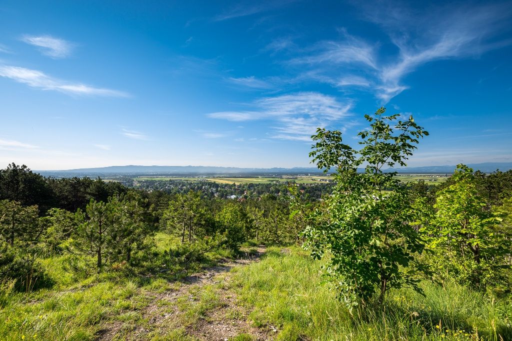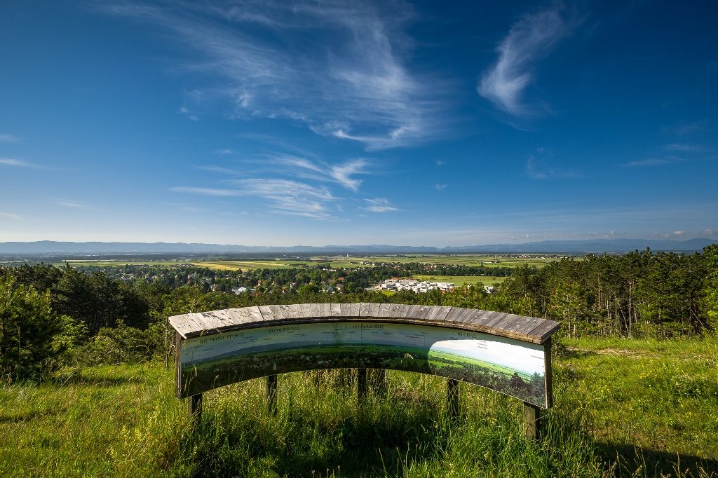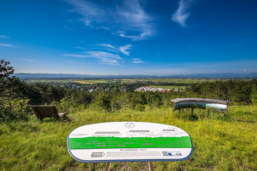 Entlang der Vorboten der Hohen Wand, dort wo Höhlen versteckt liegen und die Wälder sich sanft im Wind biegen, tappen wir heraus aus dem Piestingtal in Richtung der großen Ebene Wiens. Unser Blick schwenkt über das Wiener Becken, streift die Bucklige Welt und zeigt uns, dass jeder Alpenbogen auch einmal ein Ende hat. Entspannt lassen wir uns nach der Wanderung nieder und genießen das kristallklare Wasser in der Kristalltherme oder lassen das Schloss Fischau auf uns wirken. Die letzten Blickplätze des Wiener Alpenbogens sind der Blickplatz Rotes Kreuz und der Blickplatz Blumberg. Von hier führt der Weg noch weiter bis in das Zentrum von Wiener Neustadt. Entlang dieses kurzen Abschnitts haben wir öfters die Gelegenheit zurückzublicken und die Reise noch einmal geistig Revue passieren zu lassen.