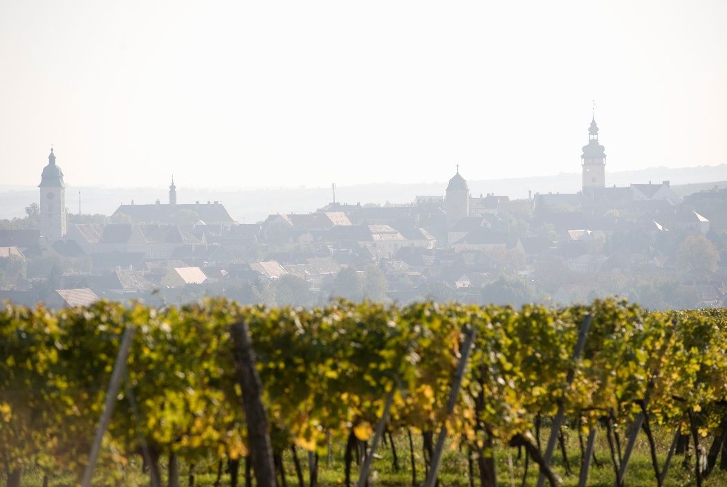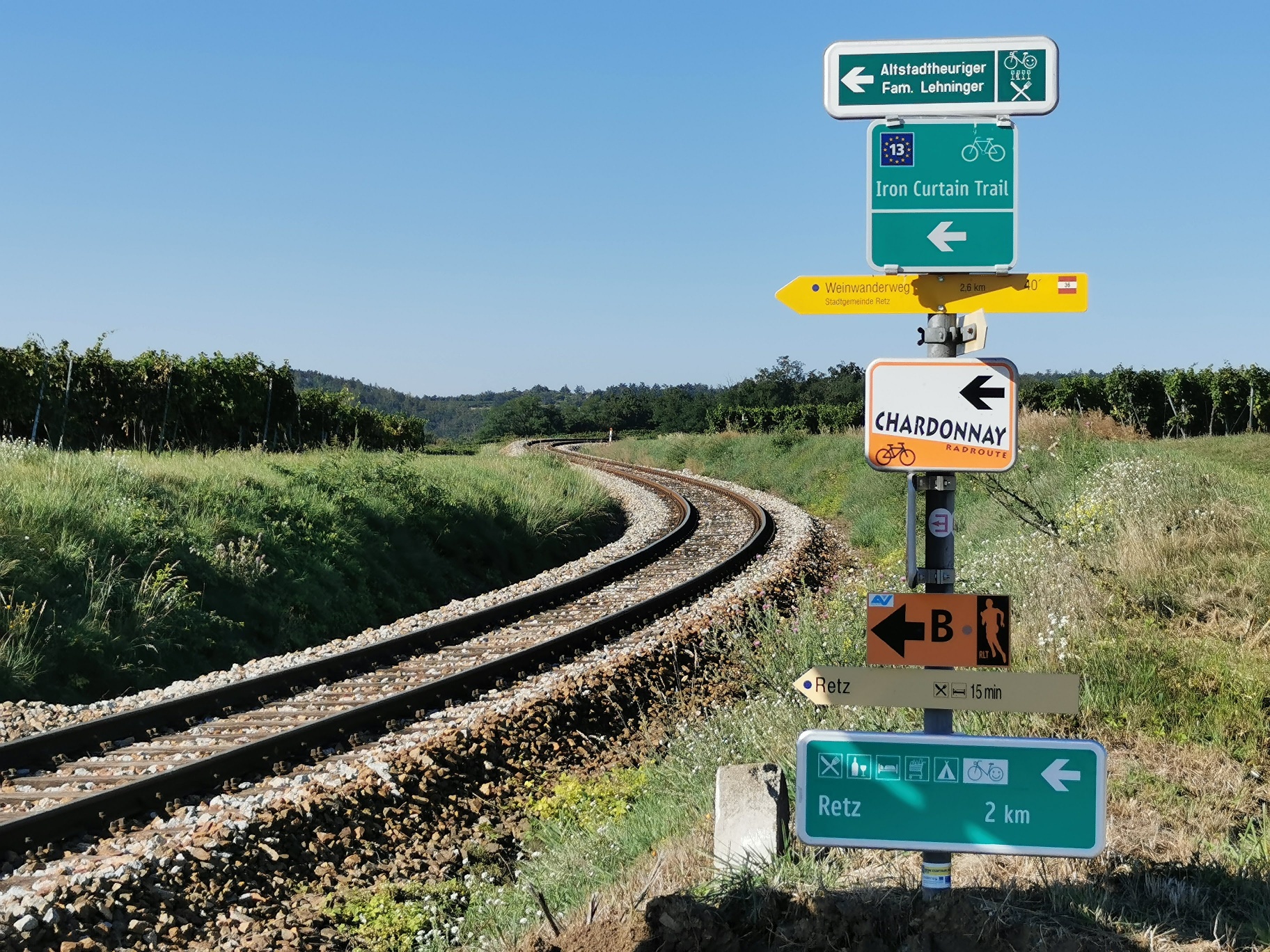 Wir verlassen den Hauptplatz –Stadtbrunnen -durch das Verderber- und Znaimertor. An der Kreuzung liegt vor uns eine Gabelung; wir wählen die linke - in die Fladnitzerstraße - Richtung Hardegg. Nach ca. 200 m biegen wir rechts in die bäuerliche Einkaufsstraße Lange Zeile ein. Am Ende der Langen Zeile beginnt der Weinwanderweg, der uns durch hügelige Weinberge, vorbei an einem Sortenweingarten, auf den Altenberg hinauf führt. Vorbei am Winzerhaus am Altenberg, Richtung Bahnübersetzung, nach rechts, wandern wir entlang des Setzberges in die Stadt zurück. Der Weg mündet in die Lange Zeile, wo der Altstadtheurige (Fam. Lehninger, Lange Zeile Nr.33) zur Einkehr einlädt.