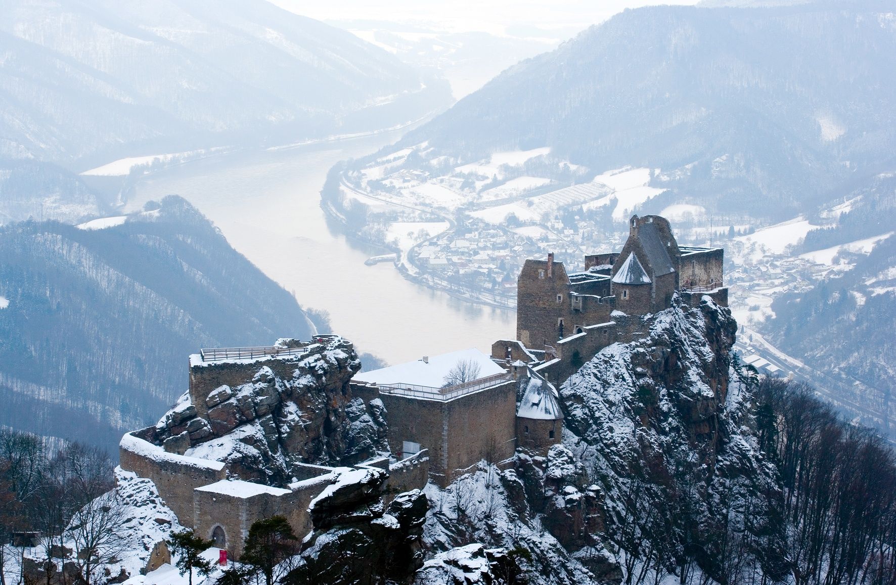Die Etappe von Aggsbach Dorf nach Hofarnsdorf führt auf abwechslungsreichen Wald- und Feldwegen hinauf zur imposanten Burgruine Aggstein und weiter in die ruhigen Winterlandschaften des Dunkelsteinerwaldes. Über das barocke Wallfahrtskloster Maria Langegg verläuft die Route durch das stille Buchental. Eine kurze, gesicherte Passage erschließt den Hohen Stein, einen der schönsten Aussichtspunkte der Wachau mit weitem Blick über das Donautal.