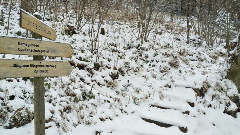 Achtung, dieser Winterwanderweg wird bei Schneelage eventuell nicht vollständig geräumt und kann glatte Stellen aufweisen. Die Benutzung erfolgt auf eigene Gefahr! Bedenken Sie bitte auch, dass im Winter Markierungen durch Schnee unsichtbar sein können und bereiten Sie sich deshalb gut auf Ihre Tour vor! Auf die frühe Dämmerung achten und bei der Tourenplanung besonders sorgfältig vorgehen.