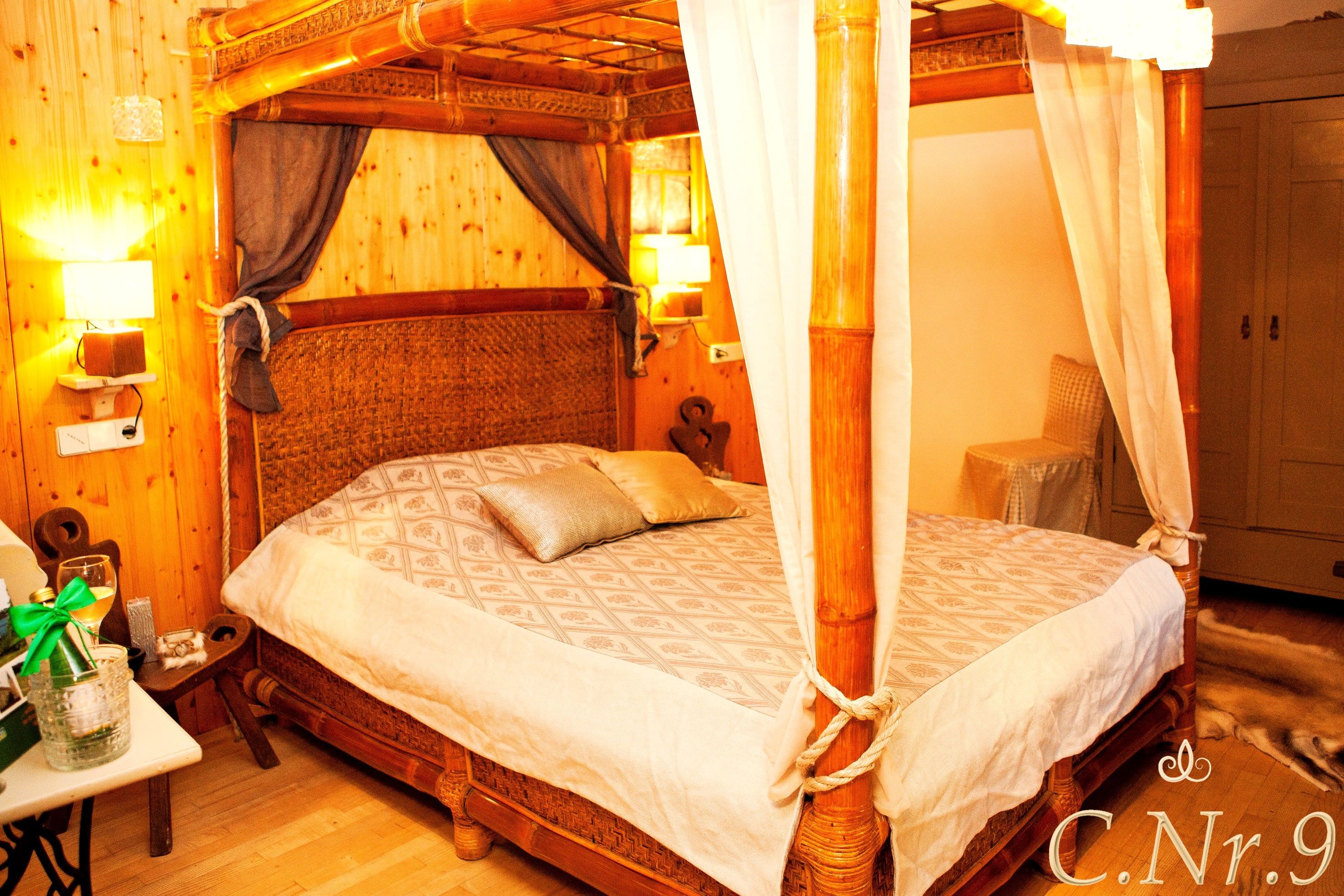 Gemütliches Schlafzimmer mit Himmelbett aus Holz und rustikaler Einrichtung.