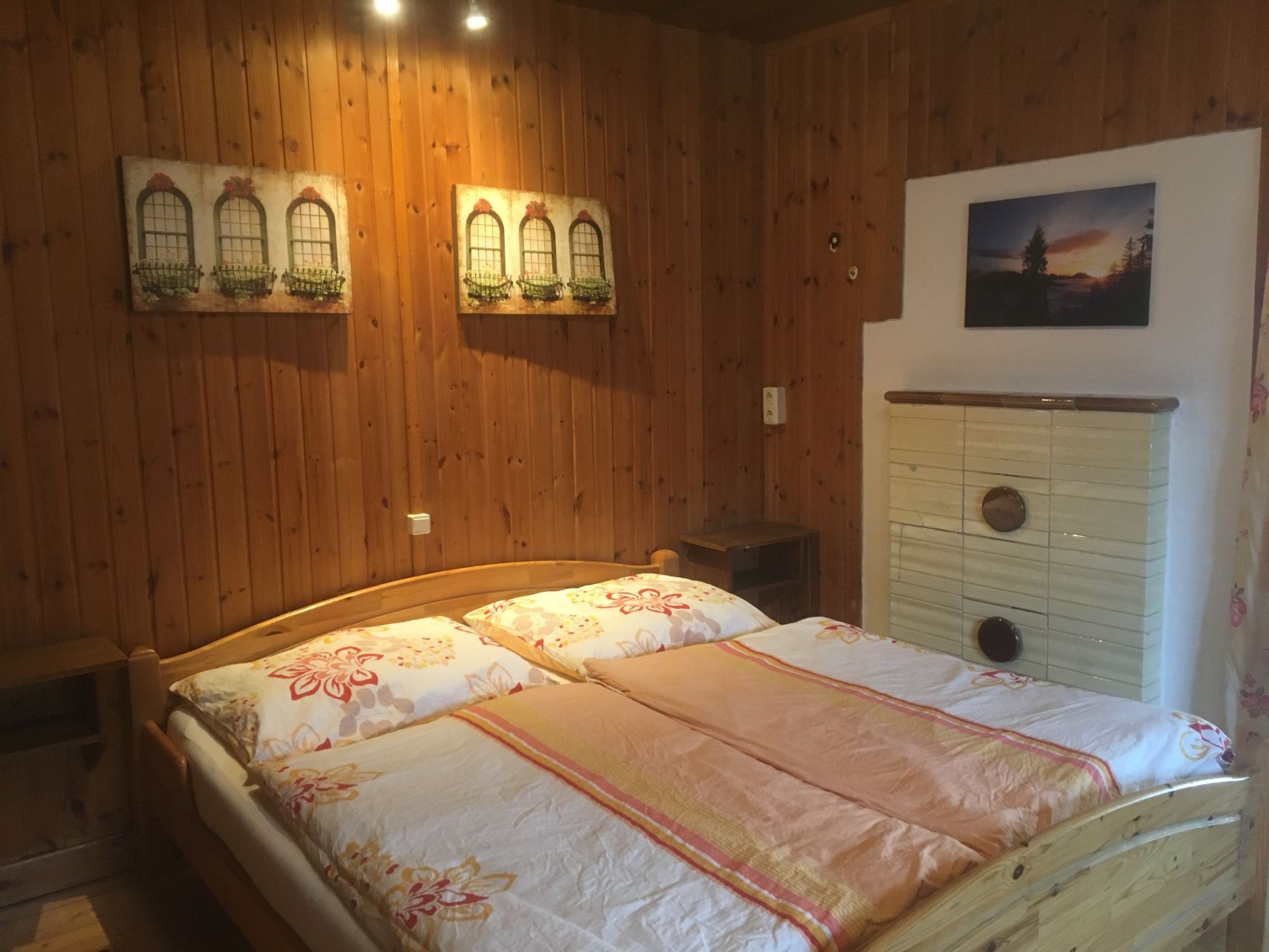 Erdgeschoß: voll eingerichtete Küche, Doppelzimmer mit Zustellbett, Holzofen und Waschbecken, separates WC.