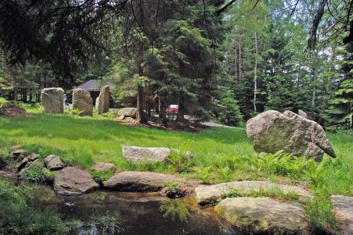 Auf einem großen Waldgrundstück liegt unser Holzhaus an einem Teich. Ein idealer Ort für traute Zweisamkeit, an dem keiner das Frühstück serviert oder die Betten macht.