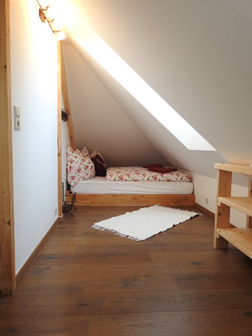 Die gemütliche Dachgeschosswohnung für bis zu vier Personen ist ausgestattet mit TV, WLAN, Kaffeemaschine, Föhn und einer kleinen Küche und bietet somit Komfort für Familien und Paare.