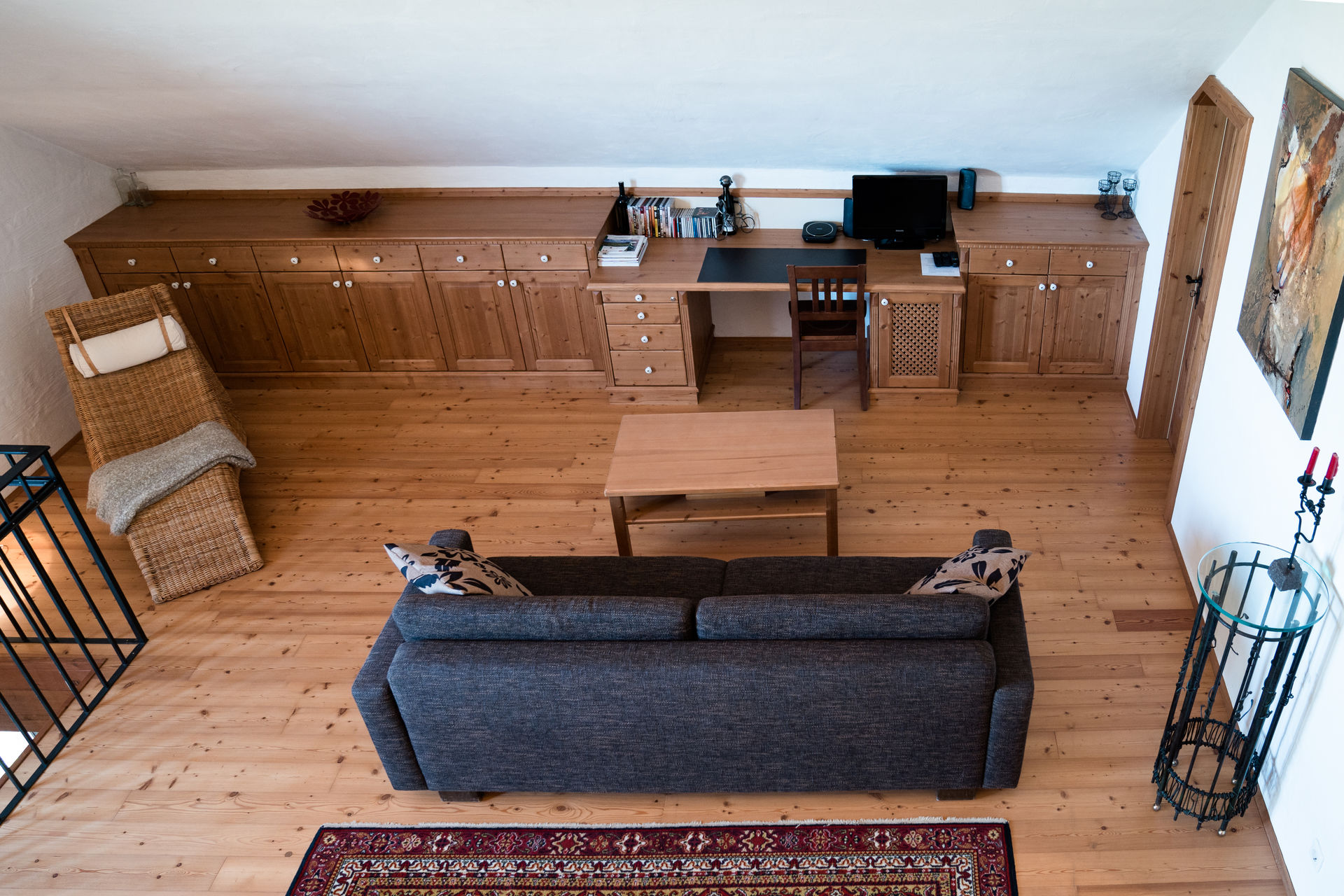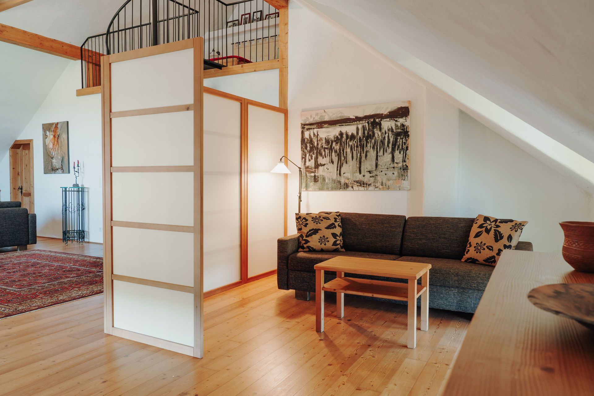 Auf zwei Ebenen im Obergeschoss stehen Schlafmöglichkeiten für bis zu zehn Personen zur Verfügung. Die einzelnen Schlafbereiche sind individuell gestaltet und optisch voneinander getrennt.