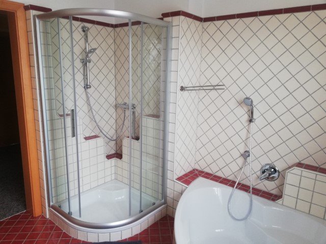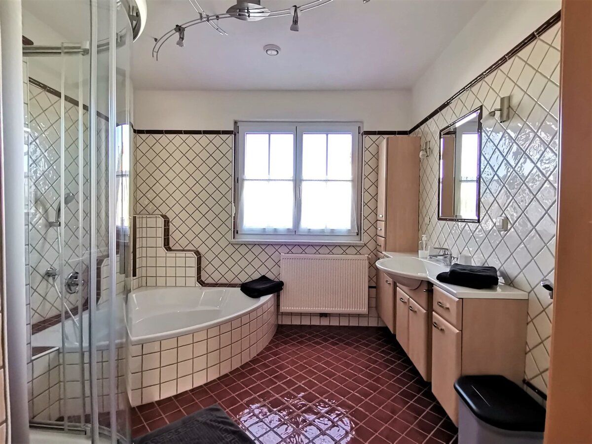 Komplett ausgestattete Küche (Induktionskochfeld, Backofen, Geschirrspüler, Kühlschrank, Mikrowelle, Kaffeemaschine, Wasserkocher, Toaster und Ausstattung für 6 Personen), Bad mit Dusche und Badewanne (Fön), Vorraum, Eingangsbereich (Abstellplatz für Fahrräder, Kinderwagen, ...) mit Stiegenaufgang (barrierefreier Zugang ist über die Terrasse möglich) und dem separaten WC.