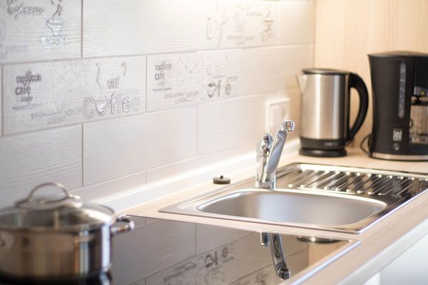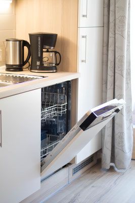 Kaffeemaschine, Wasserkocher, Geschirr, Küchenutensilien usw. sowie Strom und