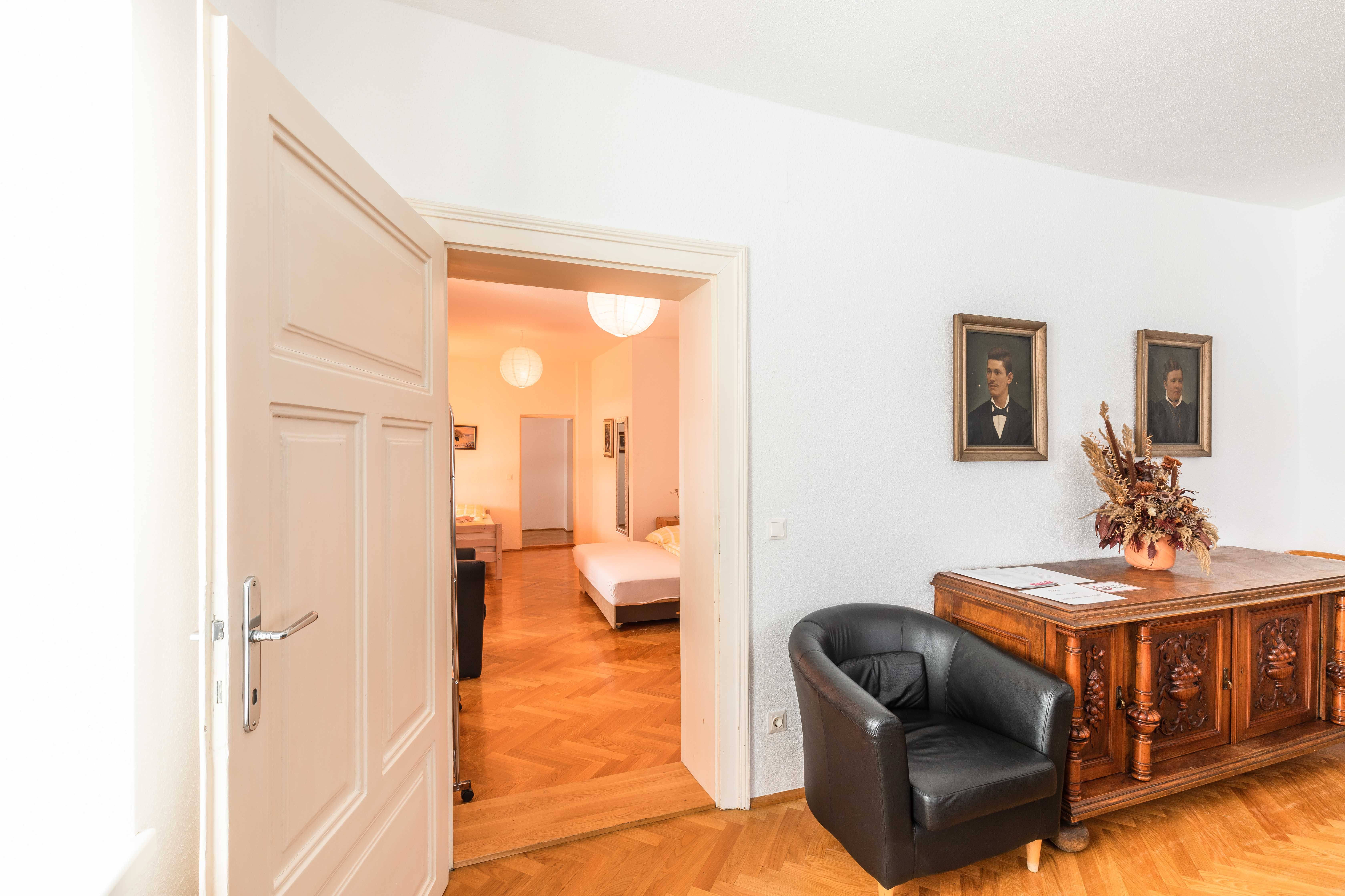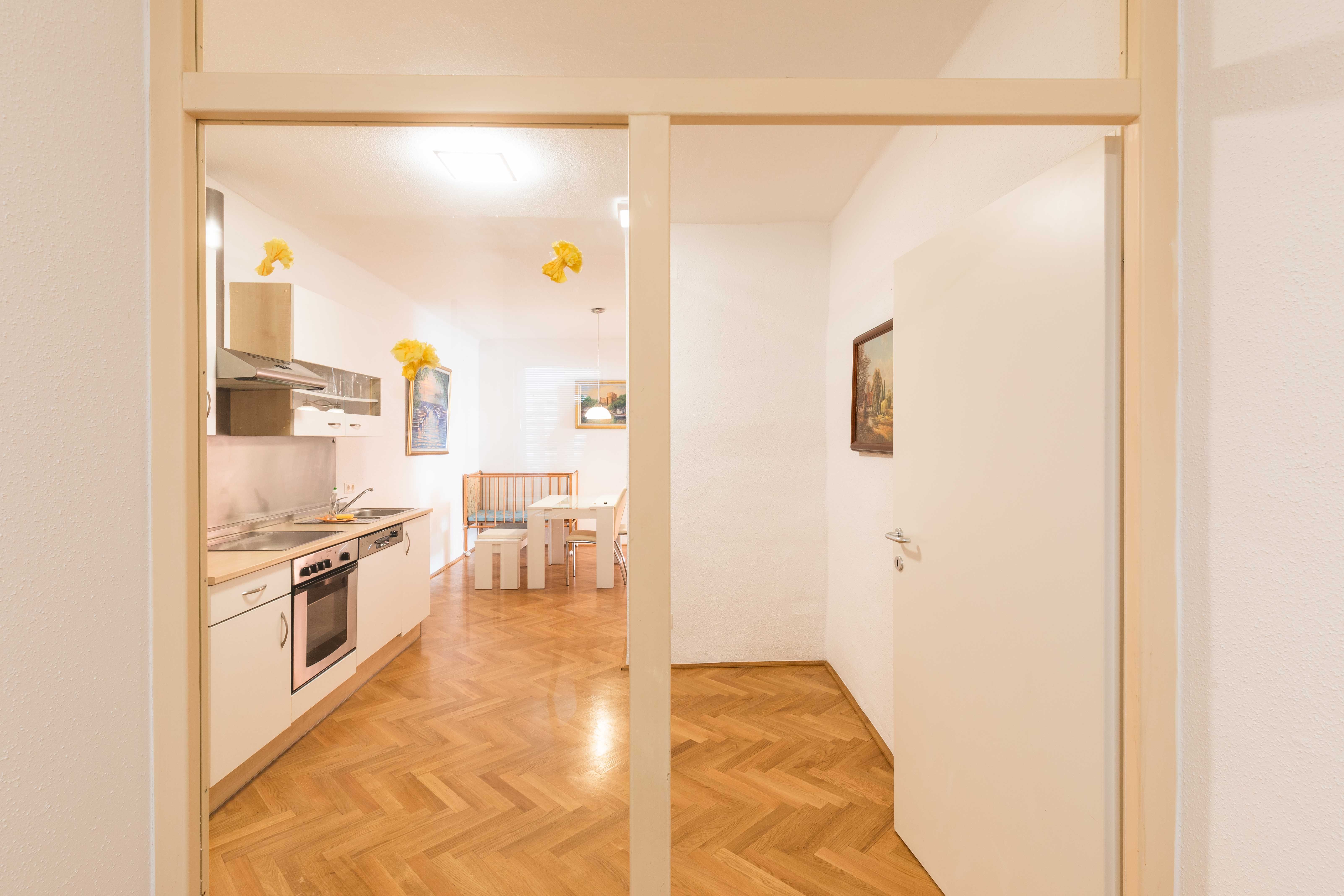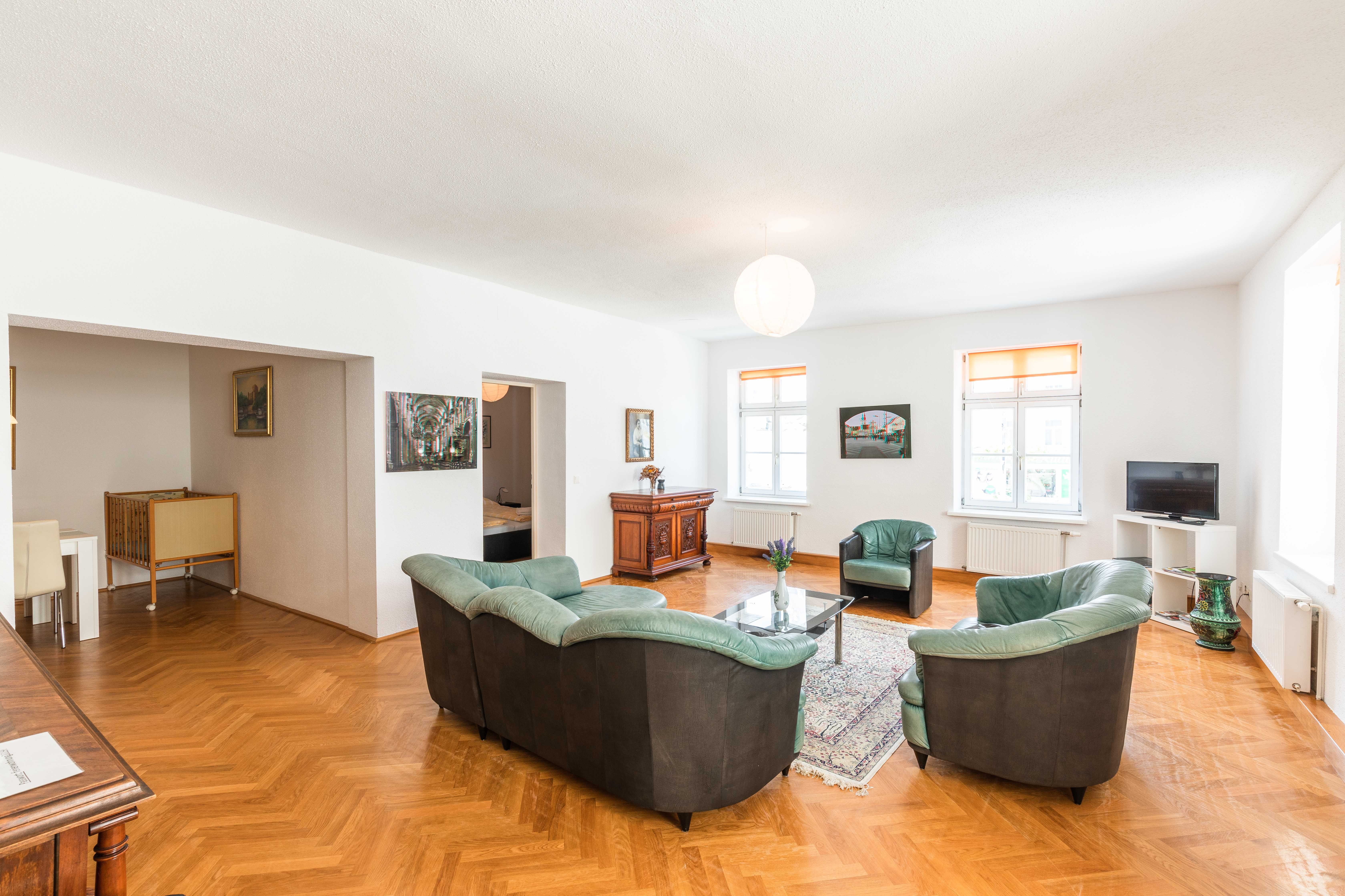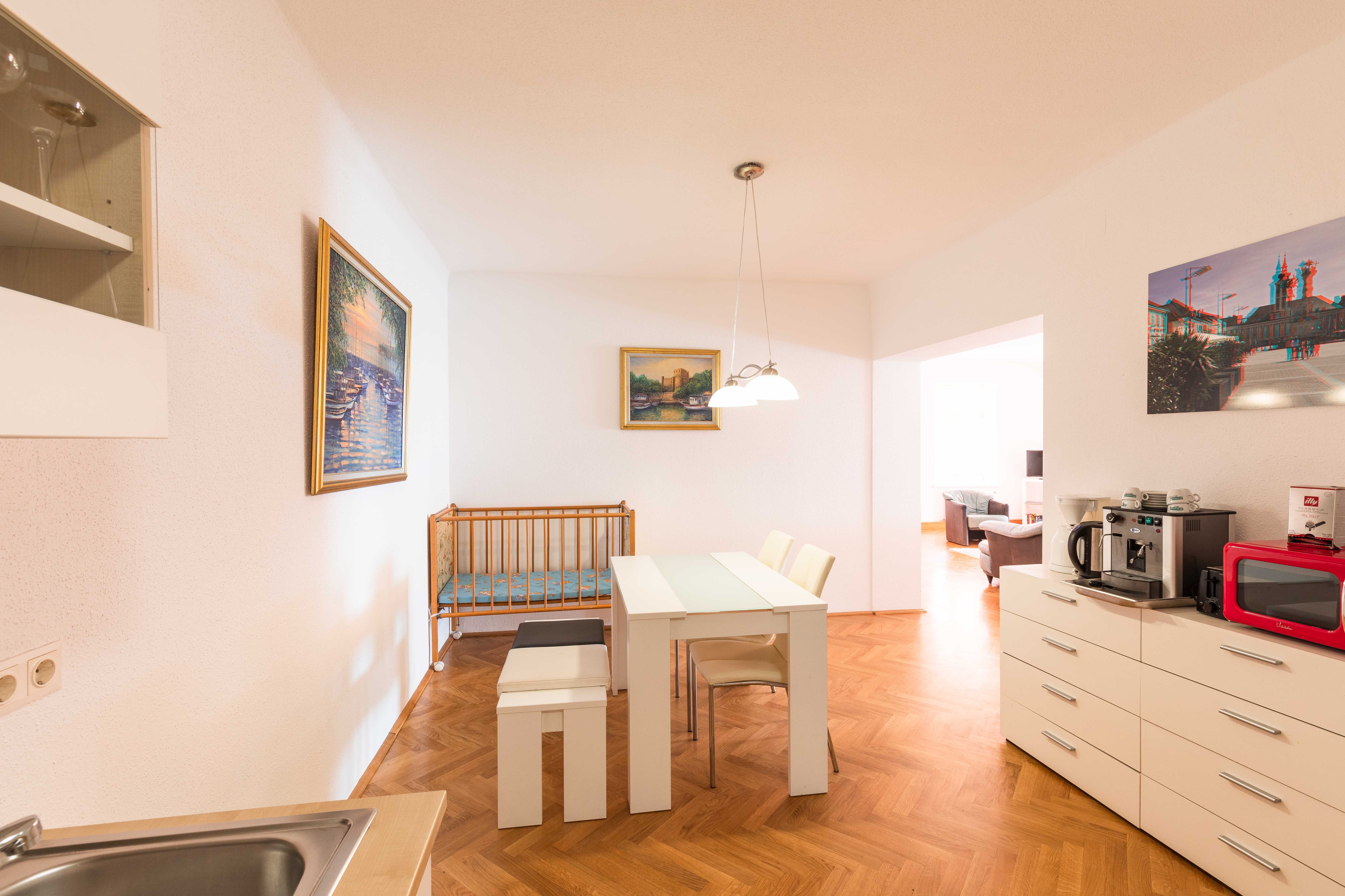 Die Wohnung ist sehr komfortabel und geräumig, ca. 120m2. Sie verfügt über ein großes Wohnzimmer, 2 Schlafzimmer, Wohnküche, Vorraum, Bad und WC und bietet Platz für bis zu 6 Personen. Die Wohnung liegt in einem liebevoll renovierten alten Stadthaus und strahlt deshalb besonderen Charme aus. Für Familien ist sie aufgrund ihrer Größe und Ausstattung speziell für Kleinkinder besonders geeignet.
