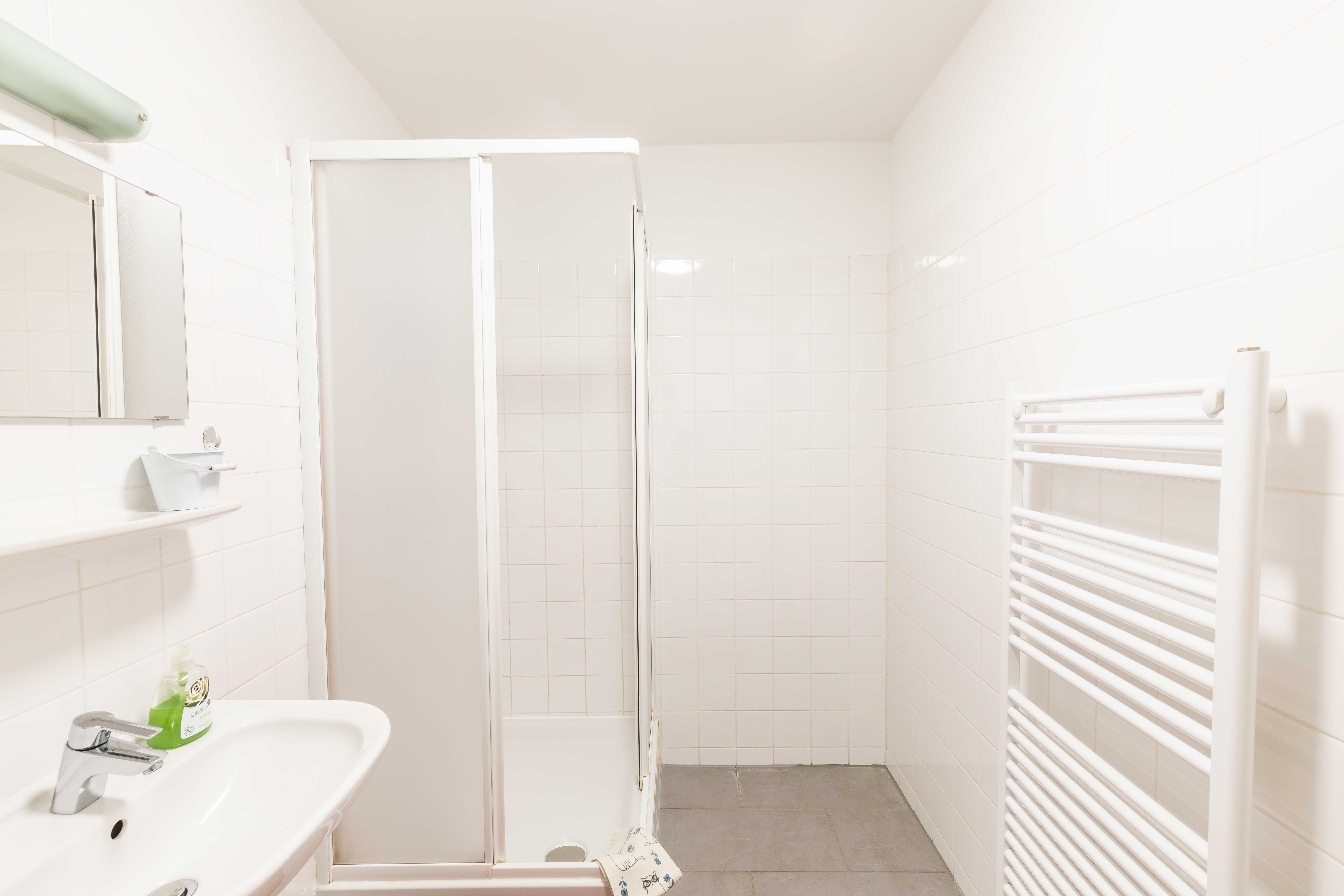 Badezimmer mit Dusche (Handtücher), Waschmaschine, Föhn