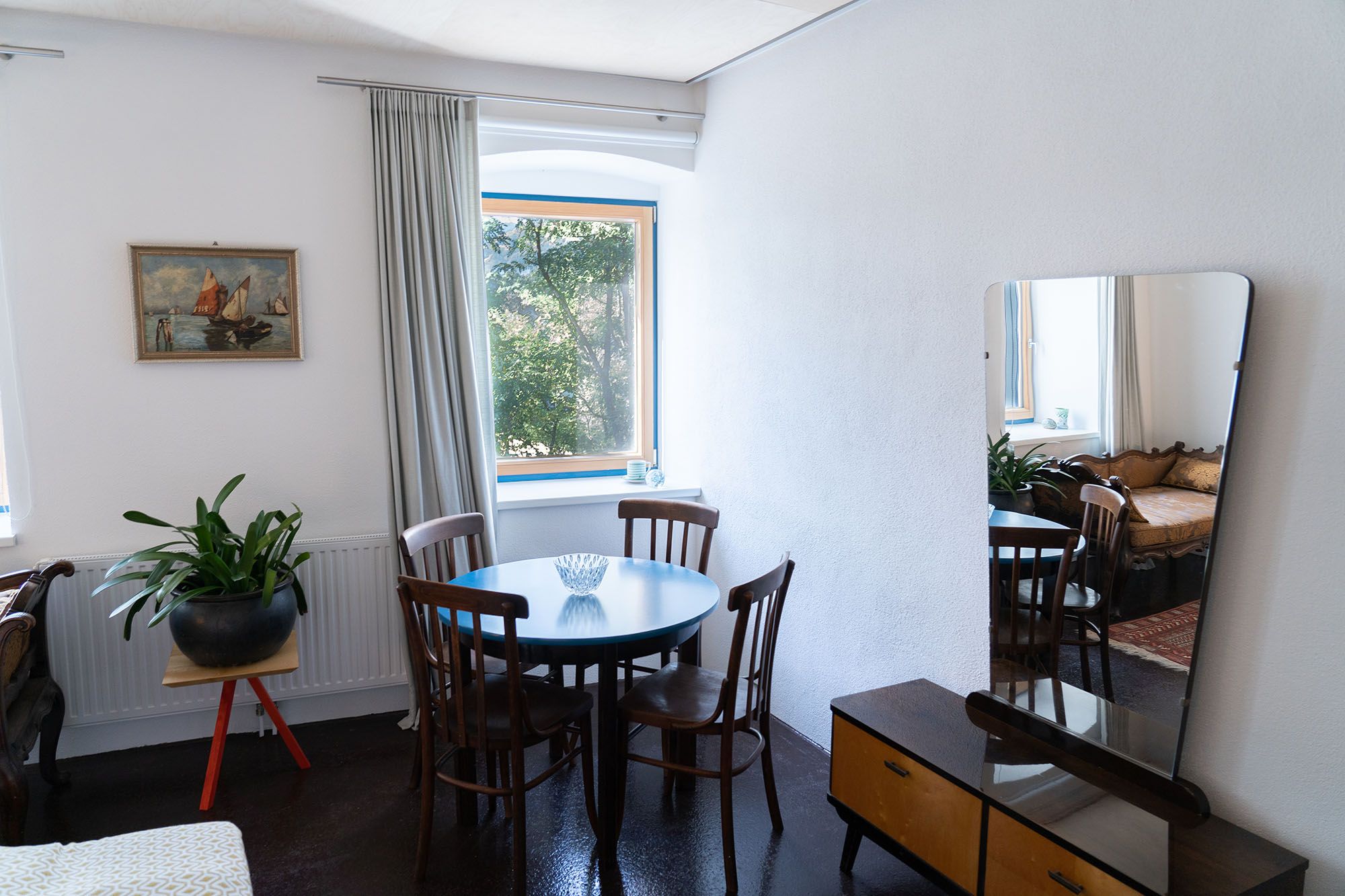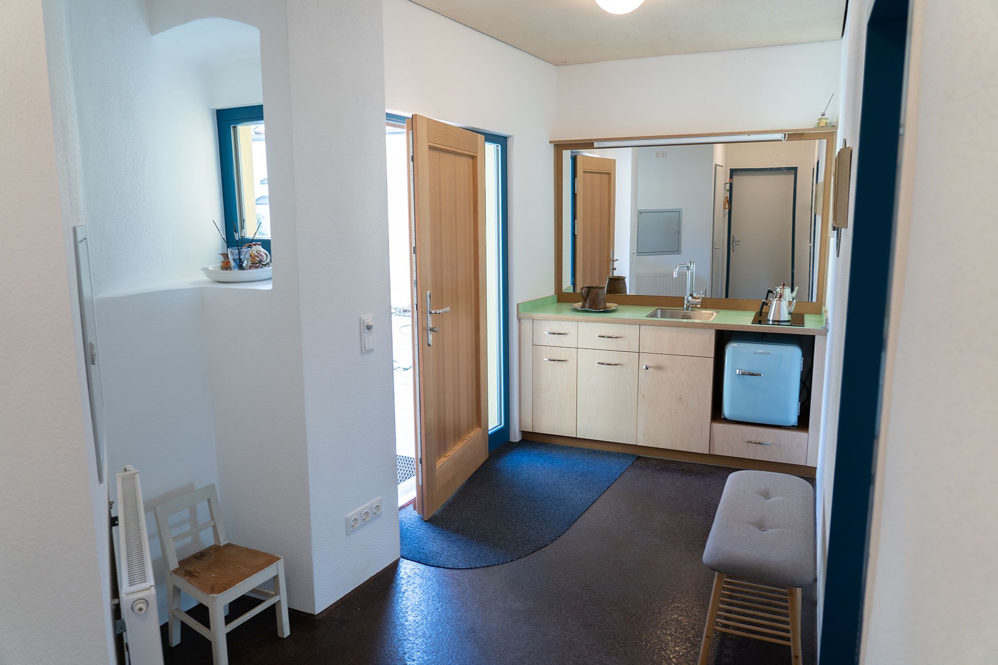 Unsere Ferienwohnungen befinden sich allesamt im historischen Teil des Hauses, dessen Bausubstanz wir haustechnisch zwar ertüchtigt, jedoch so weit wie möglich erhalten haben. Die Unebenheiten der mit speziellem, luftporenreichem Dämmputz verputzten Wände erinnern ebenso daran wie der in warmem Dunkelrot eingefärbte Gussasphalt, der die gestampften Lehmböden der Vergangenheit zeitgemäß interpretiert.