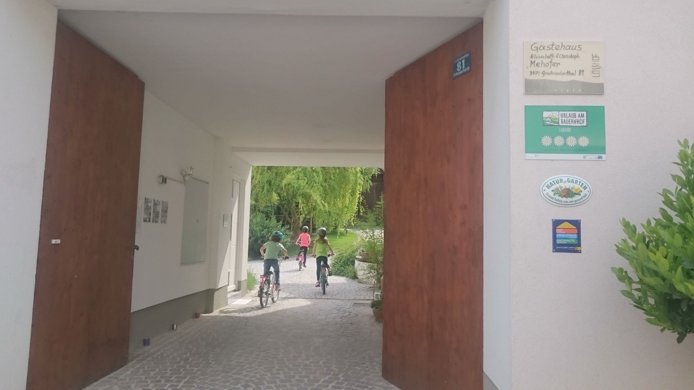 Der Innenhof und sein natürlich gestalteter Garten laden zum Verweilen ein und bieten Spielmöglichkeiten für Kinder. Unsere Katzen und Kaninchen dürfen gestreichelt werden. Sie können aus dem gesamten Bio-Weinsortiment unseres Familienweingutes Mehofer – Neudeggerhof wählen oder Traubensaft und Wasser bei Kerzenschein auf der gemütlichen Terrasse genießen.