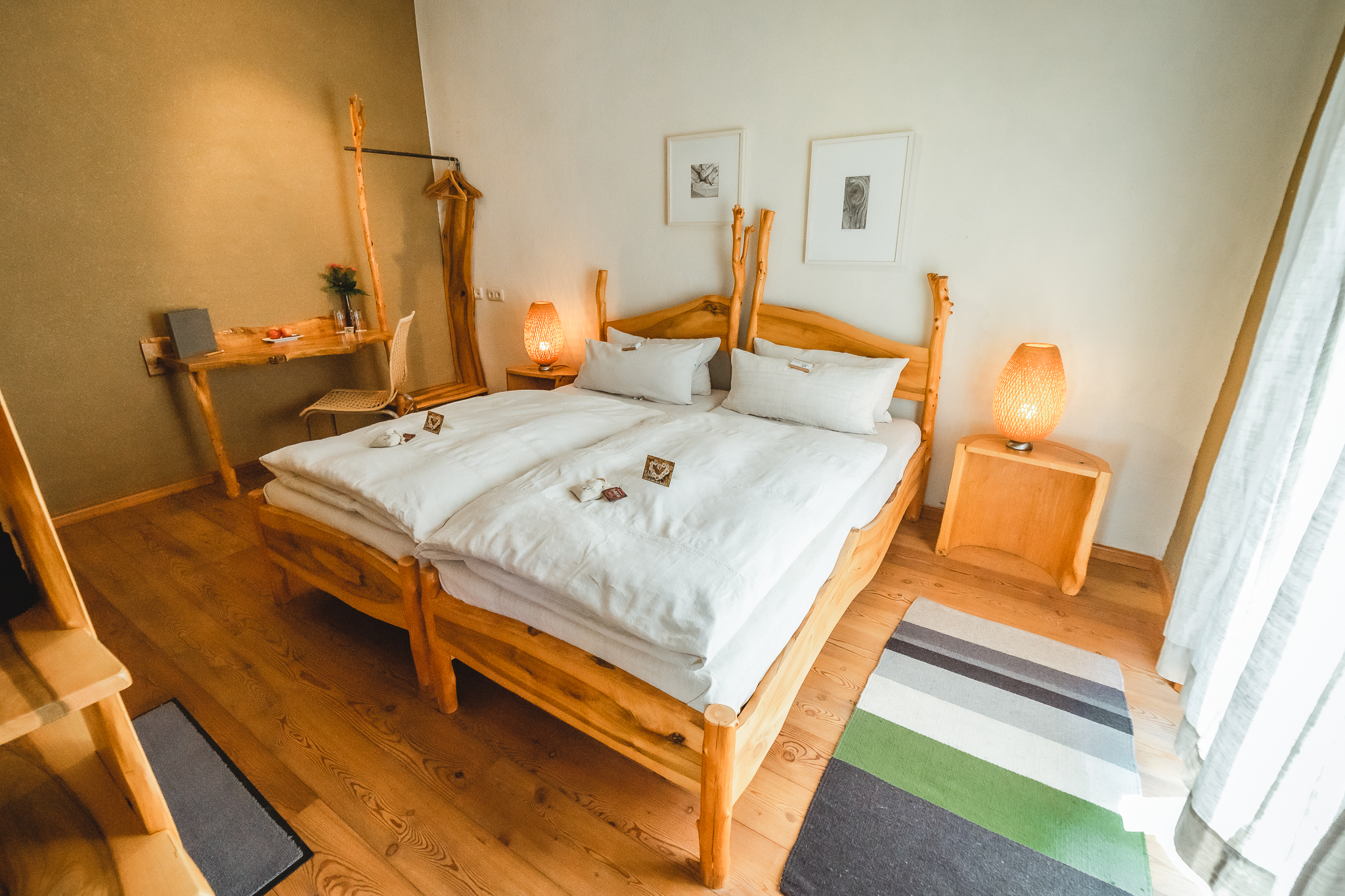 Jedes Zimmer ist ein Unikat: Ob das Stein-, Sternen- oder Holzzimmer – die Wildholzmöbel verleihen jedem Raum eine besondere Wärme. Lehmverputzte Wände und geölte Holzdielen sorgen für ein angenehmes Raumklima. Ein Stromfreischalter sowie Bettwäsche aus 100% reinem, handgewebten Leinen sorgen für einen angenehmen Schlaf. Wer es außergewöhnlich mag, genießt erholsame Nächte im Wasserbett des Wasserzimmers. Zum Frühstück gibt es ein Vollwertbuffet.