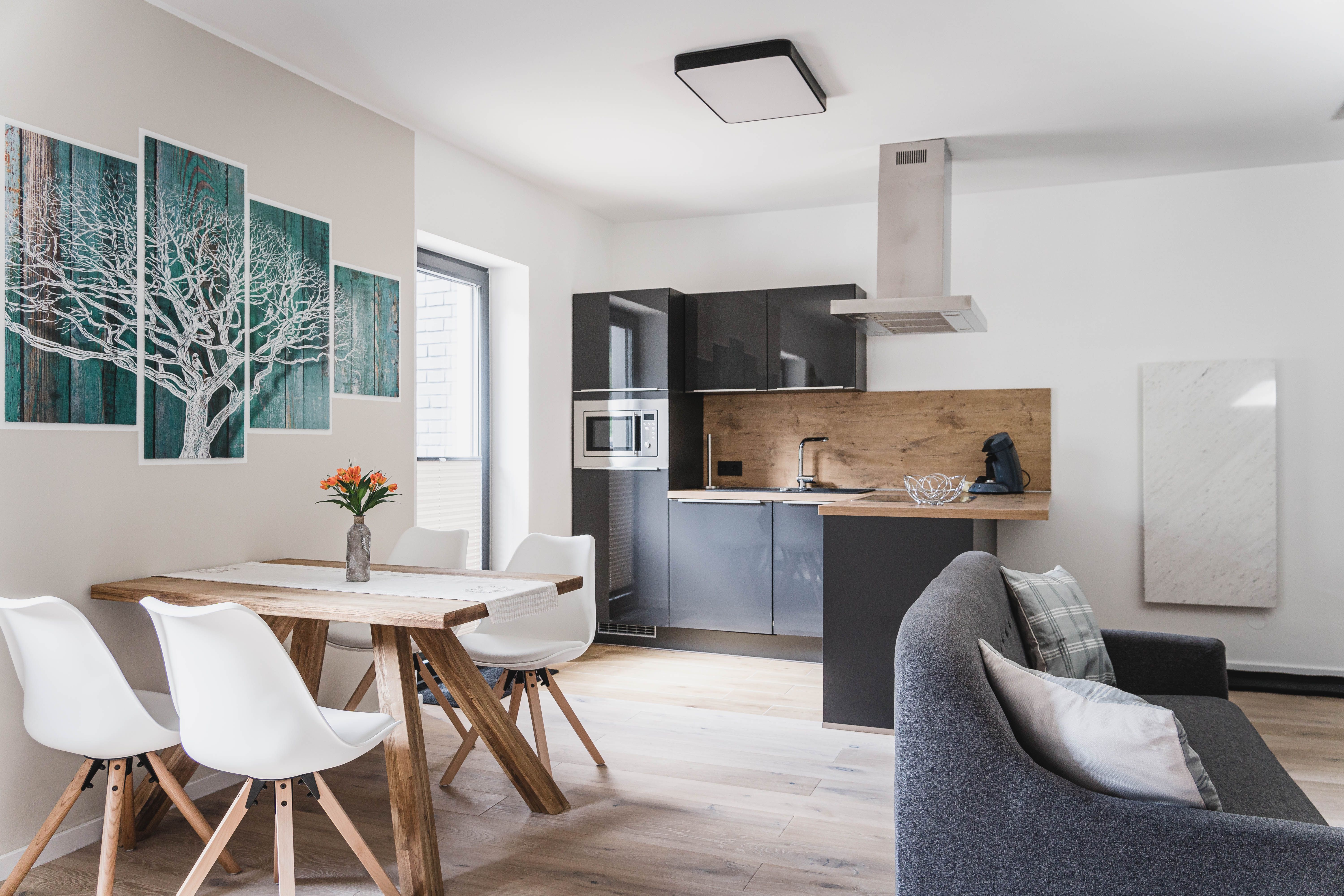 Große private Terrassen mit eigenem Grill, handgeschliffener ital. Eichenparkett,Top-Einbauküchen mit Komplettausstattung, bequeme Boxspringbetten, massive Qualitätsmöbel und große Flachbild-HD-TVs.