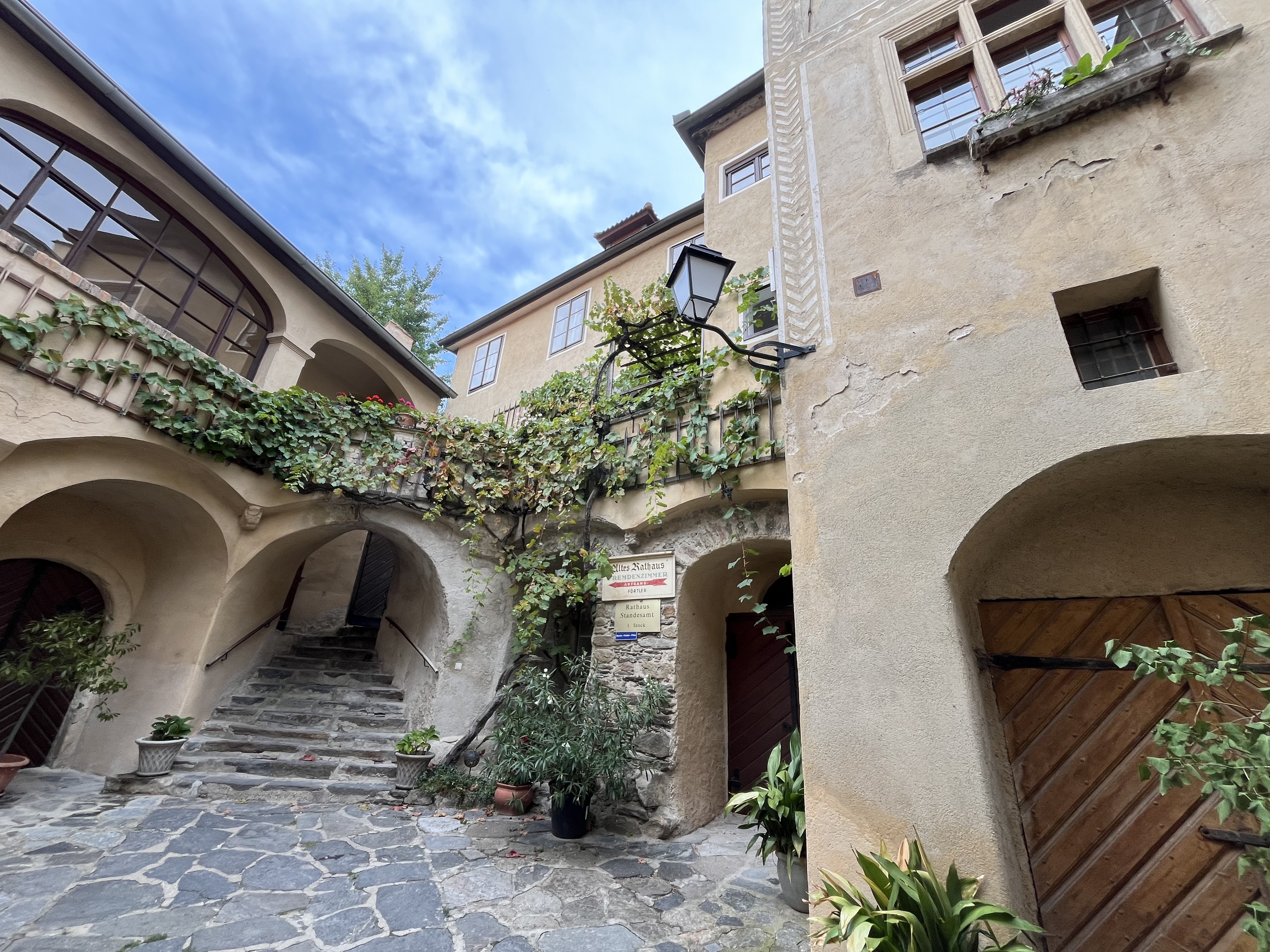 Innenhof der Pension Altes Rathaus in Dürnstein mit Pflanzen und alten Gebäuden.