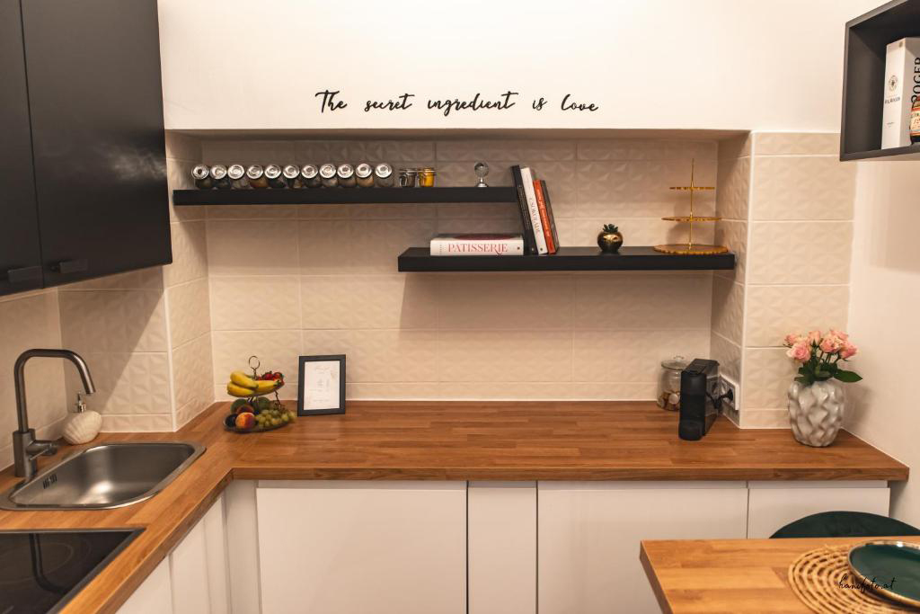 - Voll ausgestattete Küche mit Geschirrspüler, Kaffeemaschine und Essbereich.