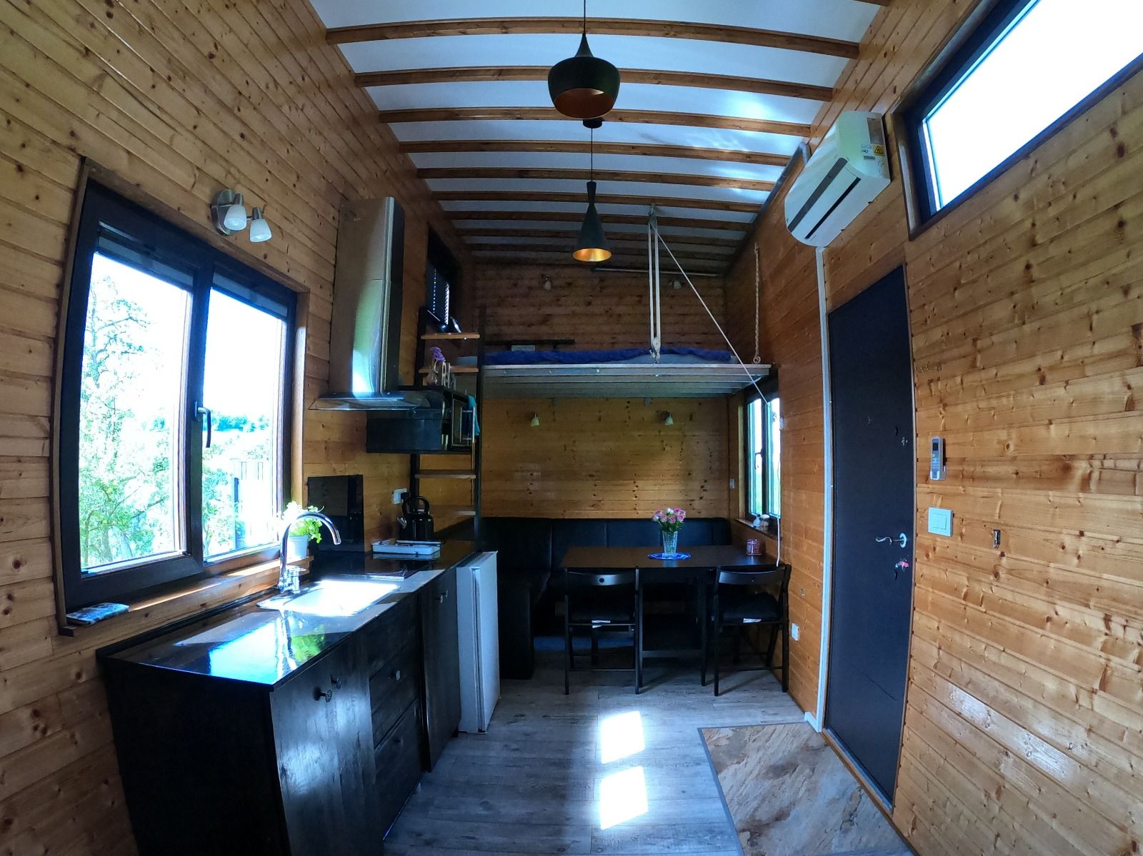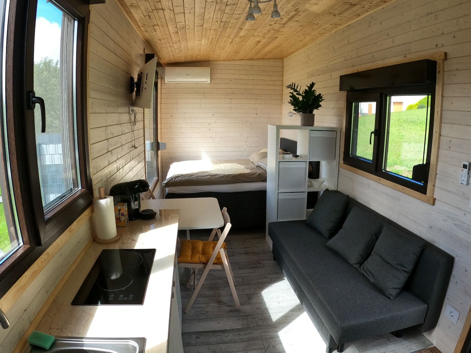 Jedes Tiny House ist mit einer Küche, Kaffeemaschine, Mikrowelle, Schlafbett, Sitzecke und einen Kleiderschrank ausgestattet. Im Bad befindet sich eine Dusche mit WC, Waschbecken mit Handtüchern und Haartrockner.