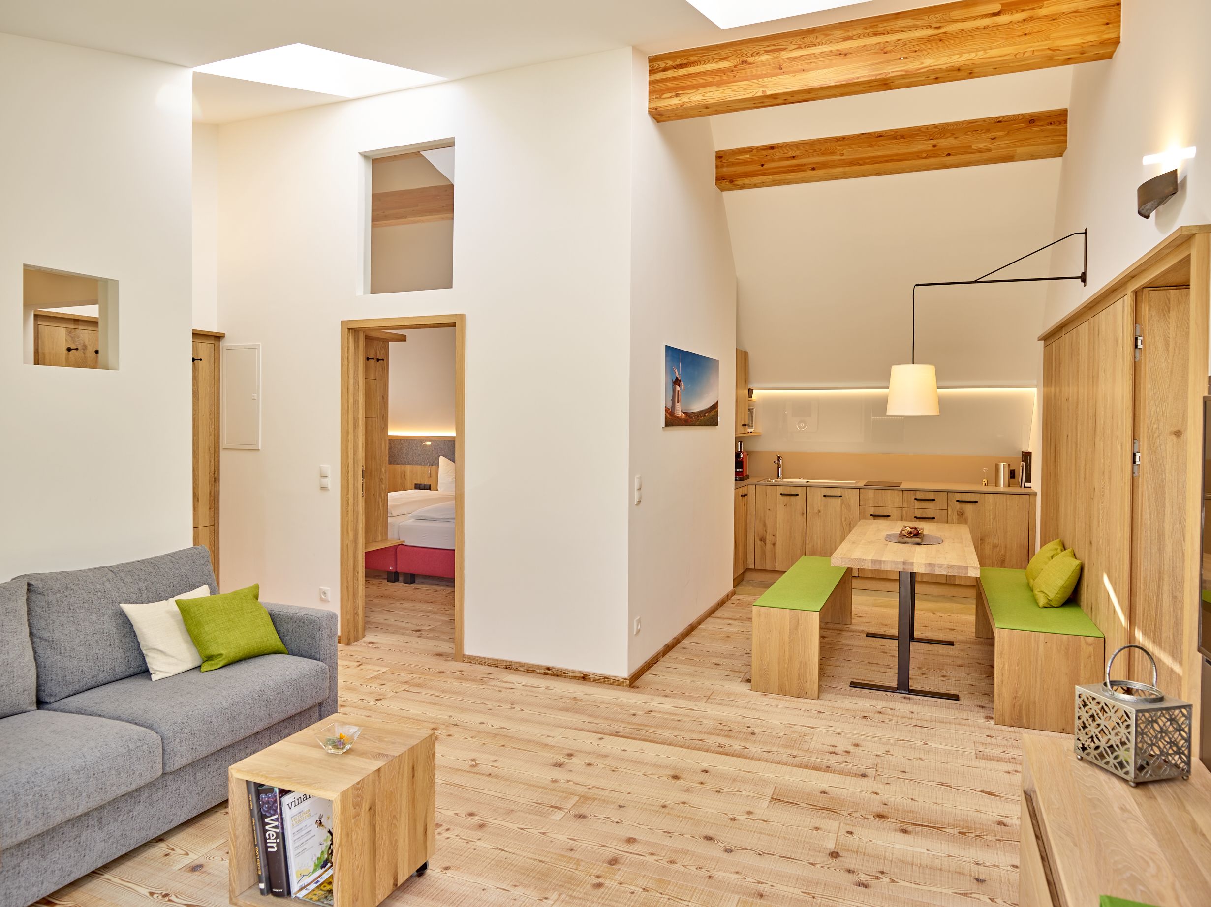 Drei ehemalige Weinkeller, drei individuelle Rückzugsorte: In Schrattenthal, der kleinsten Weinstadt Österreichs, hat Familie Hindler eine besondere Form der Auszeit geschaffen. Eingebettet zwischen sanften Rieden liegen ihre liebevoll renovierten Kellerstöckl in der Kellergasse des Ortes. Innen dominiert naturbelassenes Holz, warme Stoffe in Naturtönen und viel Licht. Draußen öffnet sich der Blick auf die umliegende Landschaft – ob beim Frühstück auf der Terrasse oder beim Entspannen am Ruheplatz mit Natursteinmauer. Der Kühlschrank ist gefüllt mit Weinviertler Köstlichkeiten, das Brot fürs Frühstück frisch geliefert. Gäste erwartet nicht nur die persönliche Handschrift der Gastgeberin und des Gastgebers, sondern auch ein gutes Glas Grüner Veltliner – gerne beim wöchentlichen Wein.Stammtisch oder in der hauseigenen Weinlounge. Aus der eigenen Landwirtschaft stammt das Weinviertler Bio Kürbiskernöl, das ebenfalls zur Weinverkostung mit Brot gereicht wird.