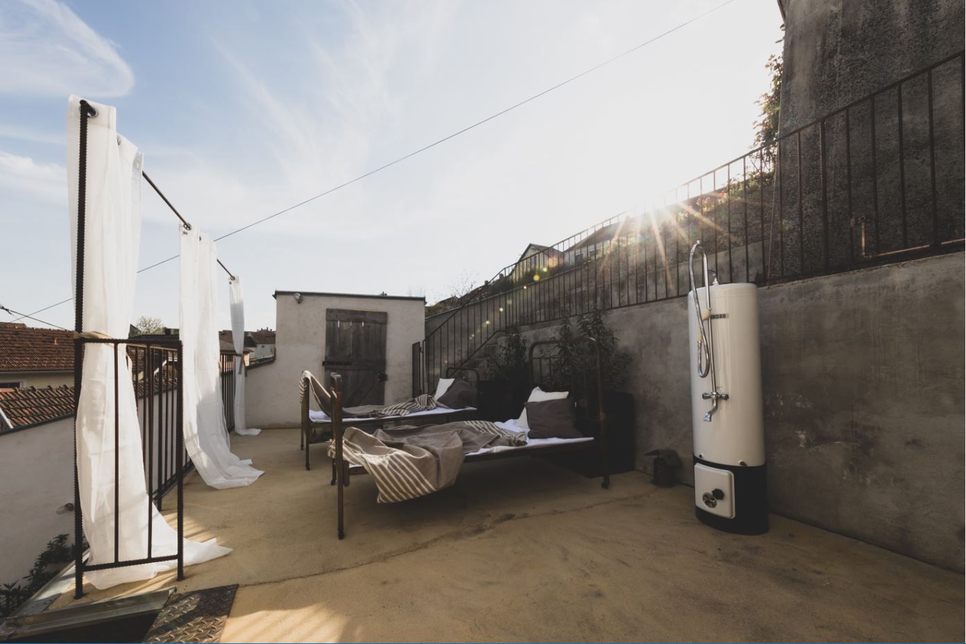 Sonnenterrasse mit Messingliegen und Außendusche