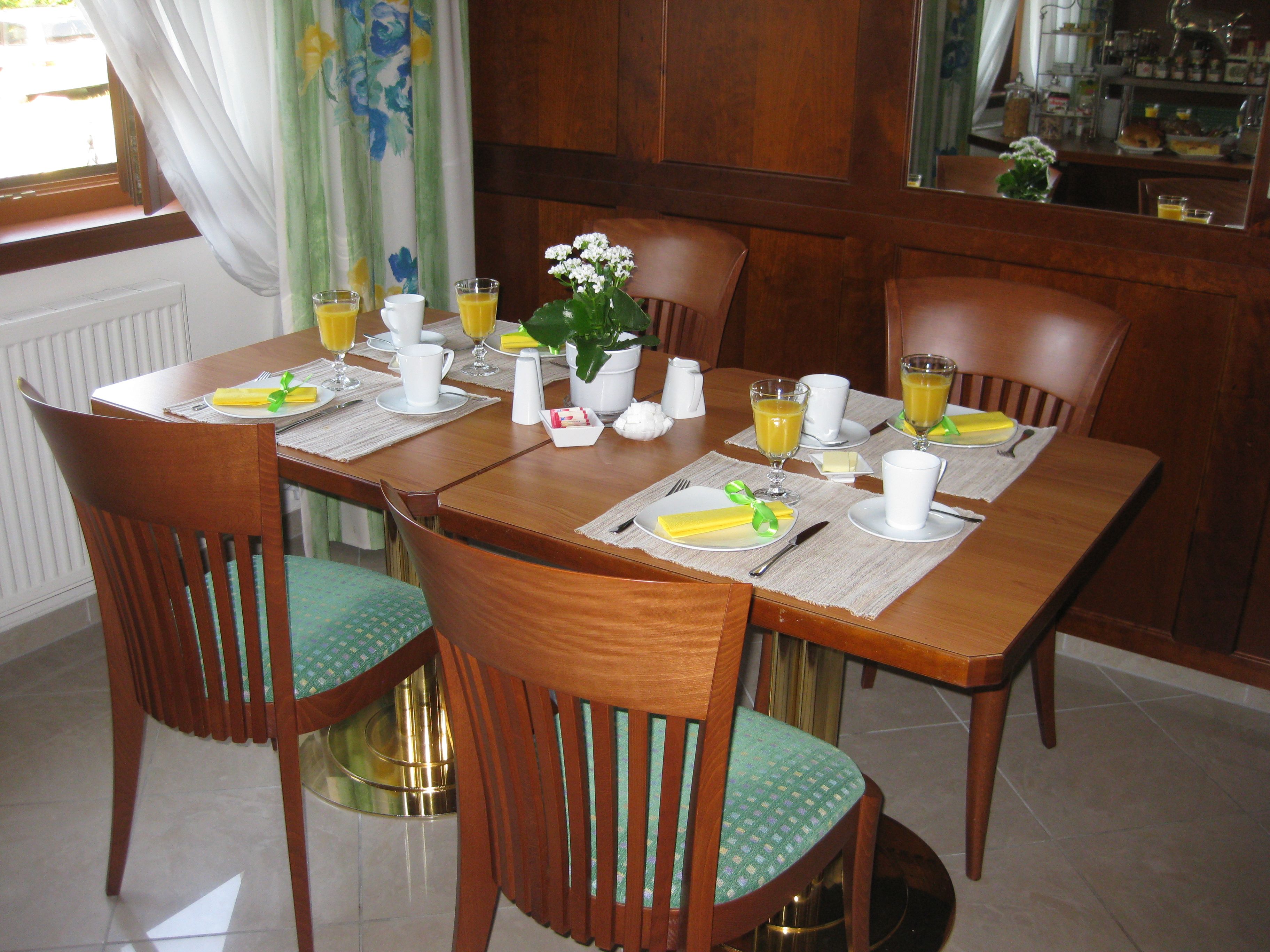 Im eleganten Frühstücksraum begrüßen wir Sie mit Frühstücksbuffet und vielem Feinen aus eigener Küche. Lassen Sie sich verwöhnen mit frischen noch warmem Brot, Wurst- und Schinken sowie verschiedene Käsesorten oder saisonalem Aufstrich.