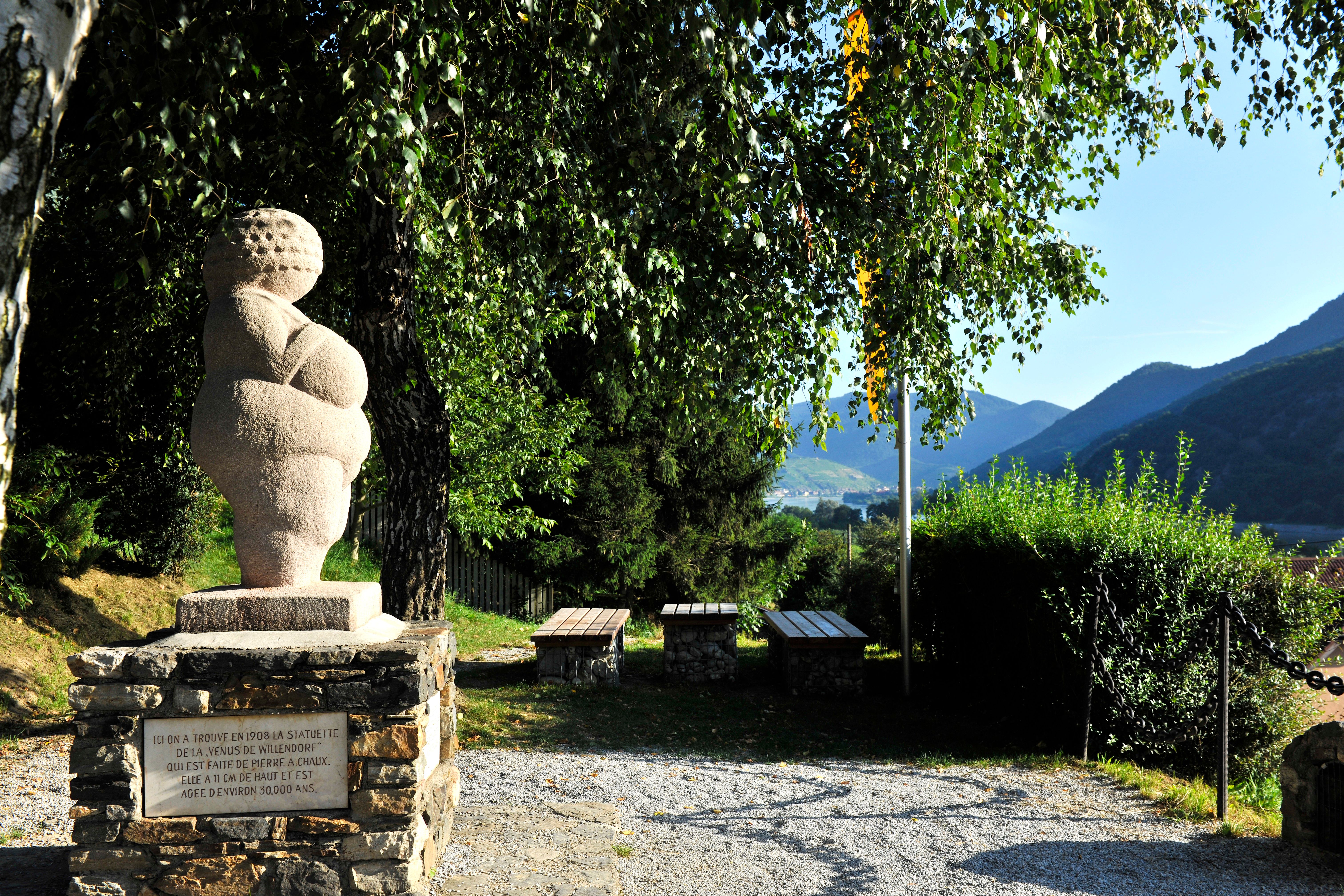 In echt ist sie nur elf Zentimeter groß – der Kopf ornamenthaft gearbeitet, der Rest des Körpers, vor allem die Geschlechtsmerkmale, sind dafür ziemlich explizit. Während man das Original, entstanden vor 25.000 bis 30.000 Jahren, im Naturhistorischen Museum in Wien bewundern kann, steht in Willendorf beim „Venusium“, nur wenige Schritte vom Fundort entfert, eine übergroße Reproduktion dieses Sensationsfundes.