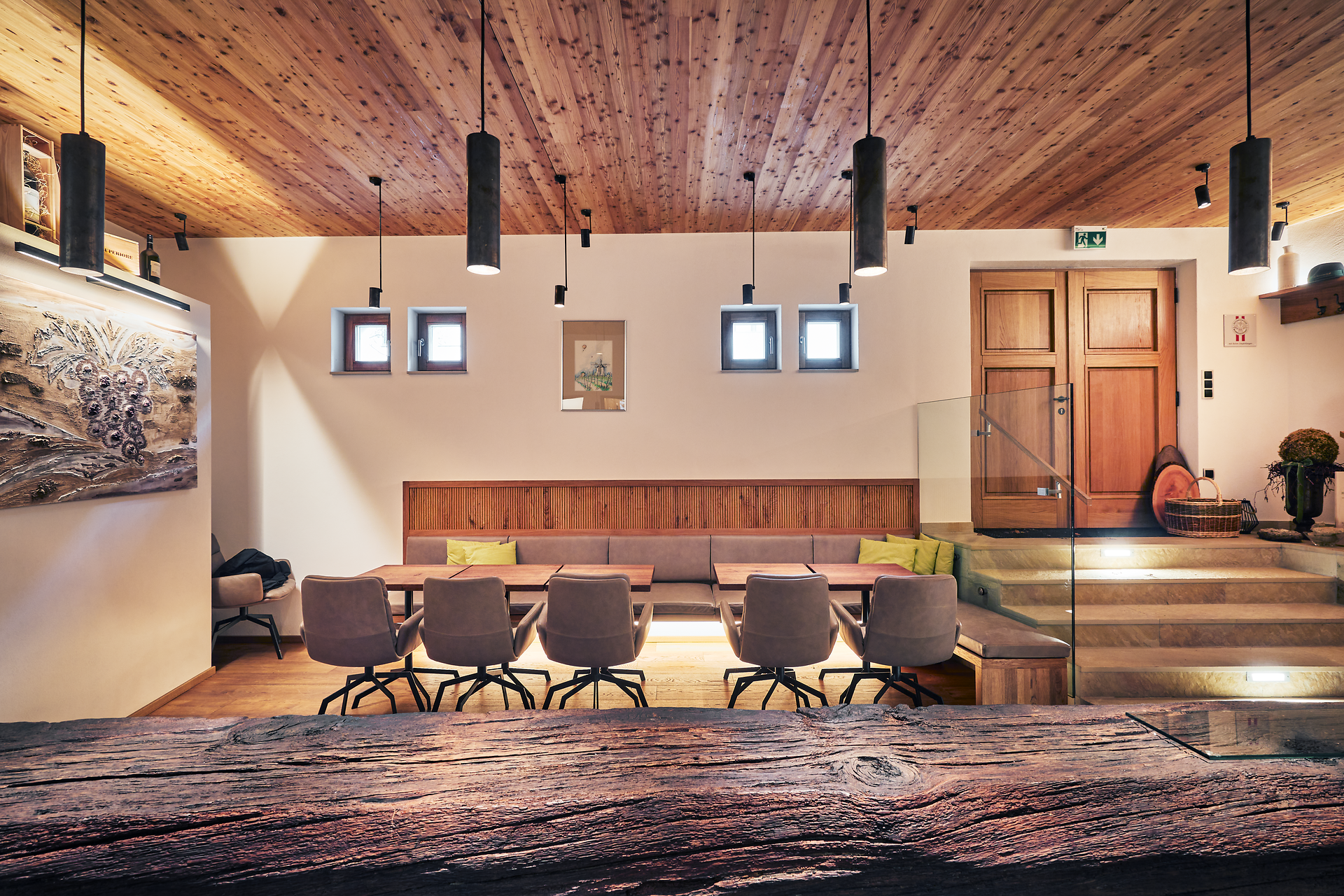 Eines der traditionellen Presshäuser wurde zur Weinlounge umgebaut. Hier findet jeden Samstag der „Weinstamm“-tisch statt. Als Weinbar dient ein alter „Weinstamm“. Immer wieder gibt es auch Events wie den „Hiatagang“.