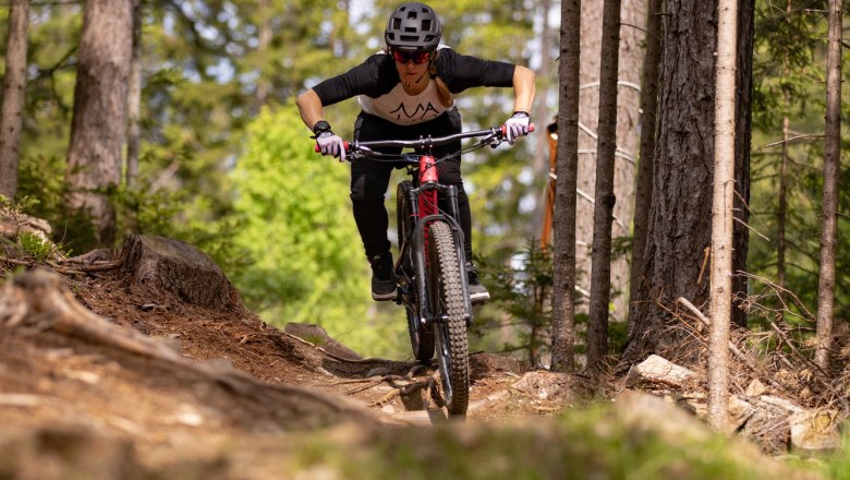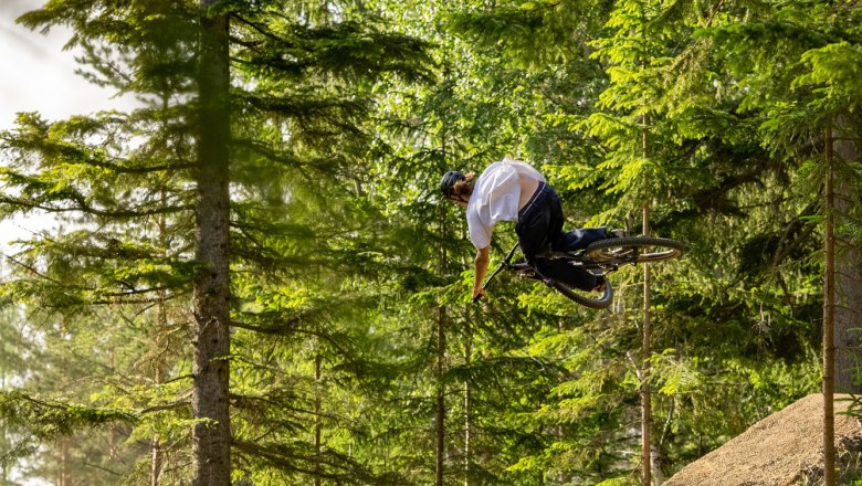 Seit Sommer 2021 befördert der Schlepplift tretfaule „Parkratten“ hinauf zum Einstieg des Trailparks, wo man die Qual der Wahl hat: fünf unterschiedliche Trails führen auf einem Höhenunterscheid von rund 200 m hinab ins Tal. Wer zum ersten Mal Bikepark-Luft schnuppern möchte, dem empfiehlt Philipp den einfachen „Bergabradweg“: eine flache Strecke, auf der keine hohen Kurven, hinterlistigen Steine oder holprigen Wurzeln warten. Erfahrenen Bike-Enthusiasten legt der Traildesigner den knackigen Singletrail ans Herz, bevor man sich dann in der nächsten Runde über Österreichs sicherste Jumpline wirft. Dort finden sich perfekte Kicker, Tables, Hip- und Corner-Jumps, dazwischen bieten die weiten Anleger ausreichend Platz, um ordentlich Fahrt aufzunehmen. Die nächste Steigerung wäre dann die Downhill Line – der schwierigste Trail des gesamten Parks. „Rough und naturbelassen“, so beschreibt ihn Philipp und kann ein verschmitztes Grinsen nicht verbergen. Denn dieser Trail lässt Downhill-Herzen höherschlagen: Zahlreiche Wurzeln, Steine, Felsabsätze und technische Jumps sowie Off-Camber-Sektionen warten hier auf die Expert:innen. „Eine wirklich intensive Line, die nicht zu unterschätzen ist“, sagt Philipp ernst und reicht mir mein Bike zurück. Der Bremshebel sieht wieder aus wie neu, es wird Zeit, dass wir unsere Fahrt fortsetzen. Denn vor uns liegt das Herzstück des gesamten Parks: der Flowtrail.